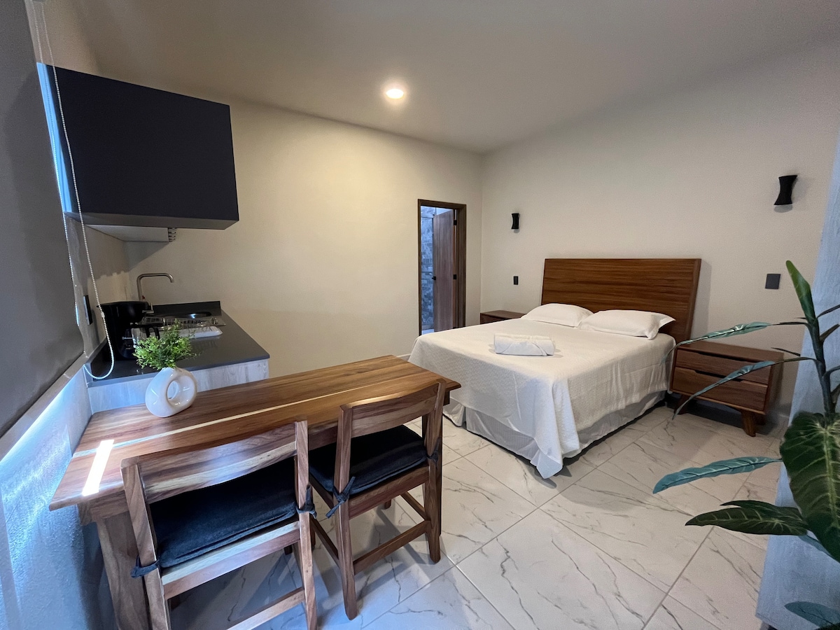 Hyggeligt studie i det bedste område i Guadalajara: Chapultepec/Santa Tere. Denne bolig i vores hjem, med alle bekvemmeligheder, så du kan få et fremragende ophold, udstyret køkken, komplet badeværelse, fjernsyn, højhastighedsinternet, aircondition, komfortabel lænestol og queensize-dobbeltseng, overdækket udendørs område, som du kan nyde og slappe af i. Tag en gåtur gennem vores nabolag og den amerikanske koloni, og nyd de restauranter, butikker og barer, som dette område af byen tilbyder dig.