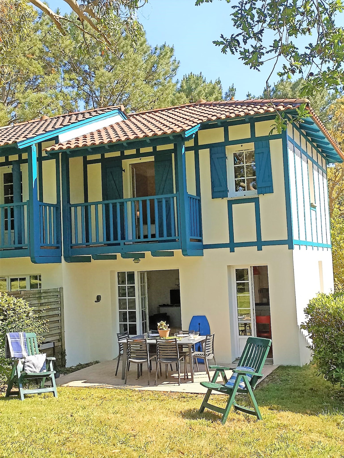Nyt hus omgivet af skov ved siden af cykelstien og strande på Landes-kysten Den består af en stue med amerikansk køkken, 3 soveværelser, herunder 1 master-suite med badeværelse og toilet, og endelig et andet badeværelse og separat toilet. Fiberinternet 🛜 Udendørs en sydvendt swimmingpool på 4 x 8,5 m, opvarmet fra april til 11. november med anlagt have og 110 m2 træterrasse. Strand og golf i Moliets og maa 10 minutter væk Vieux boucau 15 minutter Hossegor 28 minutter. Biarritz 50 minutter