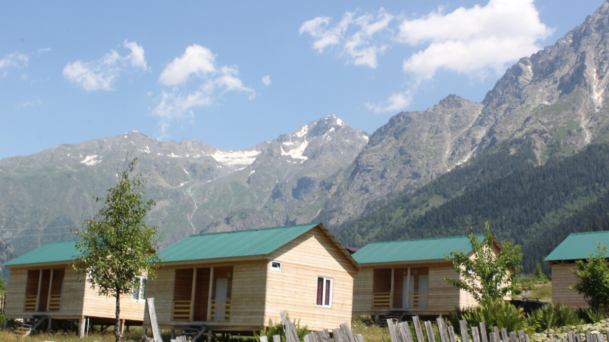 The Cottages are located at the base of Mount Ushba. from here you will have an incredible view of Ushba and much more. Each room in the cottages has its own private bathroom. we can organize transfers, breakfast, lunch, and dinner.