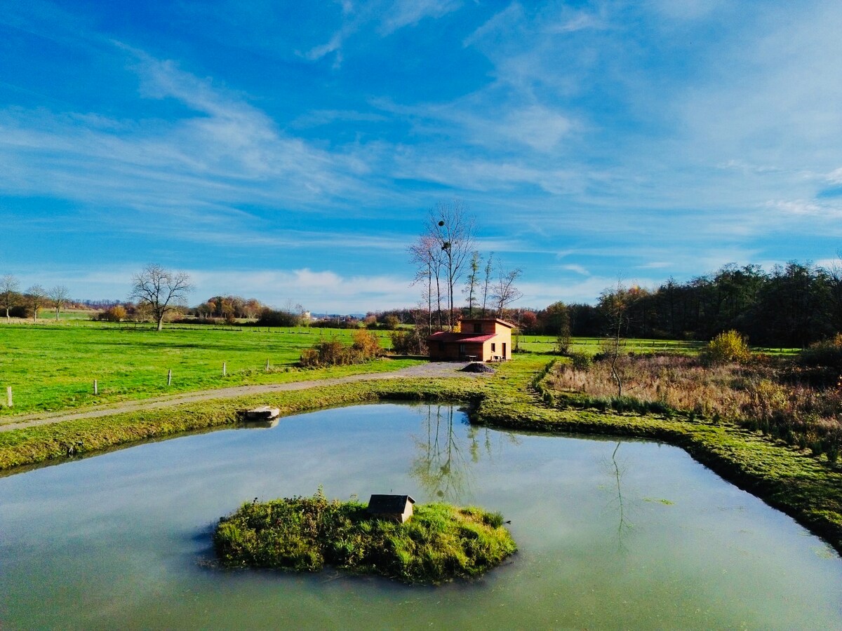 En fredfyldt oase ved en dam: afslapning, fiskeri, pétanque, vandreture og mountainbiking. Stor terrasse, 1500 m² skovbevokset grund, petanque (boules medfølger), fiskeri på stedet og gratis parkering. Butikker 5 minutter væk, mange steder at besøge inden for 1 time. Chalet med soveværelse (dobbeltseng + enkeltseng), udstyret køkken, elektrisk grill og plancha. Alle bekvemmeligheder til et ophold i naturen som par eller familie!
