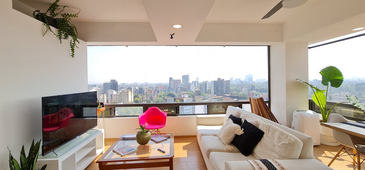 Denne enestående og hyggelige penthouse ligger inde i en af de mest emblematiske bygninger, der er bygget i La Condesa-kvarteret. Dens arkitektur er en moderne version af Art Deco. En stil, der definerer La Condesa. Det ligger i et smukt område med træer. Der er en meget familieorienteret stemning med unge og livlige mennesker. Omgivelserne inviterer os til at gå ud, gå, slappe af og opdage nye oplevelser.