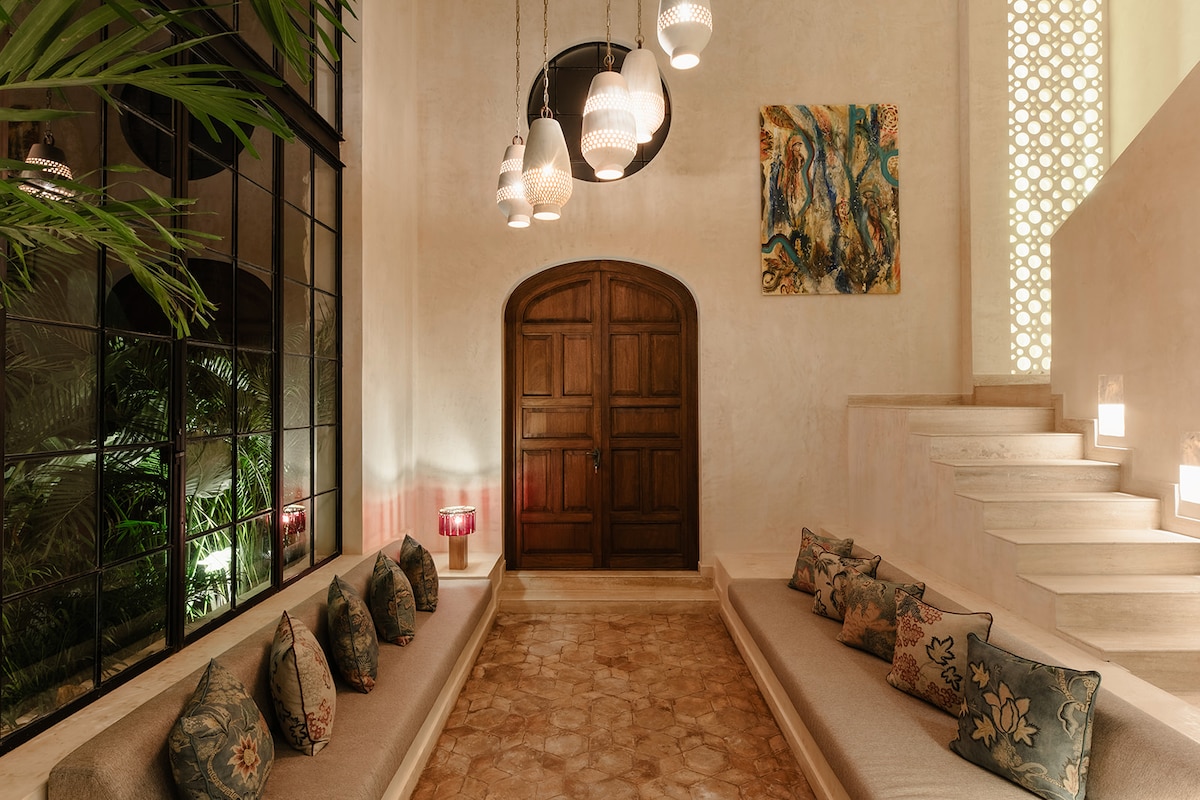 Den ideelle base til at udforske Yucatan eller slappe af i smukke omgivelser. Huset ligger på en stille gade i det historiske centrum af Merida og har plads til op til 6 gæster i tre soveværelser, har et separat kontor/tv-rum til arbejde eller fritid og har et stort køkken/stue/spiseområde med masser af naturligt lys. Du kan slappe af under poolens palapa eller i den vinbedækkede centrale gårdhave, grille på tagterrassen eller nyde solnedgangen fra klokketårnet.