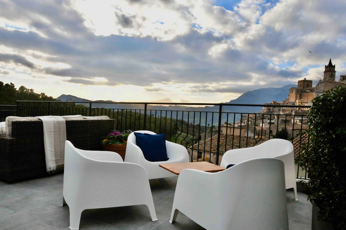 Casa Villea is a newly renovated apartment on the first floor of our house. As its access goes through an outside staircase leading directly to your terrace, you will have complete privacy during your stay. Situated halfway between Palermo and Cefalu Inside you will find a bedroom with a queen-size bed, a large living room with a sofa bed for two (a sliding wall allows to privatize the night area), a kitchenette, a bathroom, and a 30m2 terrace with a sea view.
