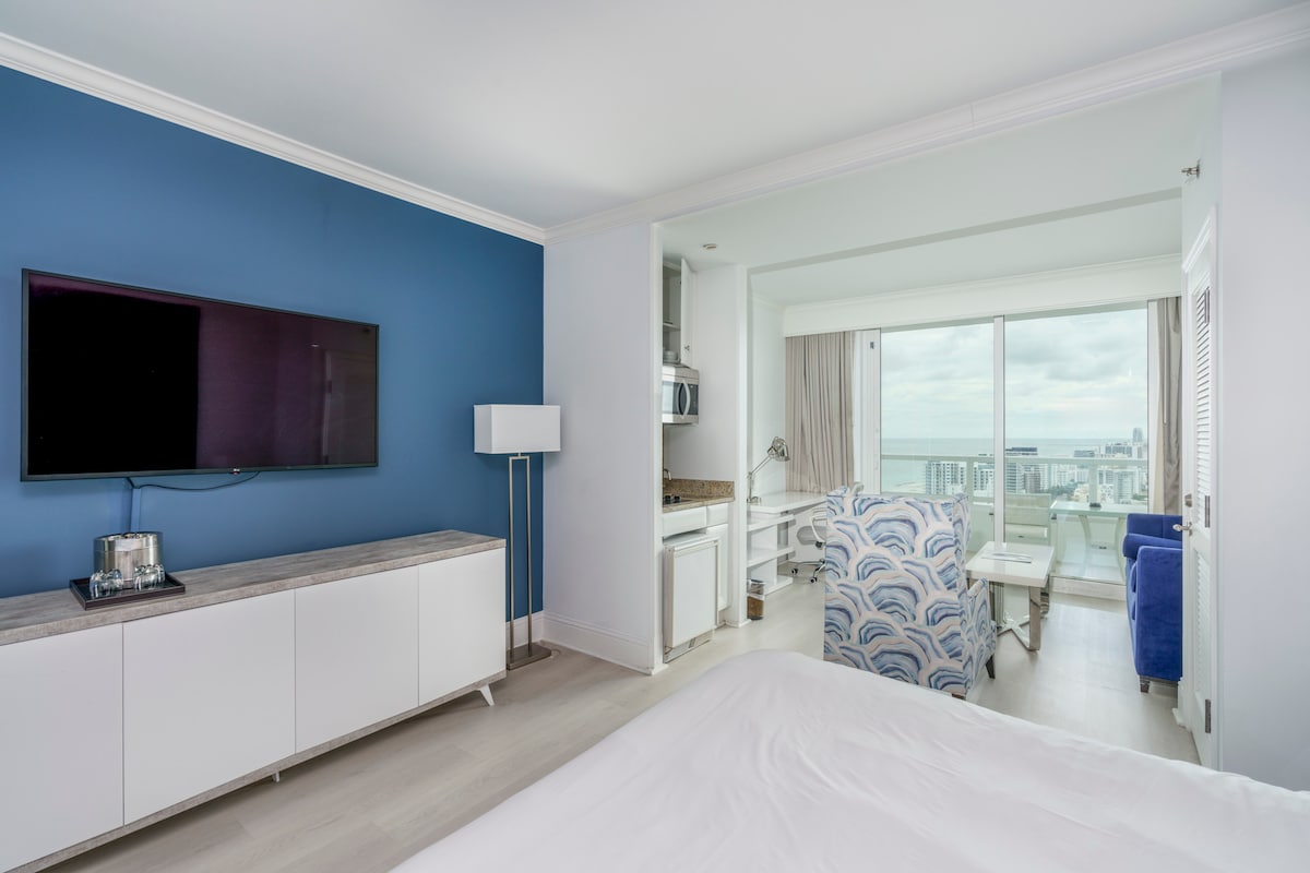 Welcome to Pure Miami Beach! Escape to this modern beachfront studio in sunny Miami Beach, Florida, with breathtaking 180° ocean views. Relax in a plush king-size bed, stream on a 65” 4K Samsung TV, or work with private 300mb WiFi and ethernet connections. Stay fit in the renovated gym, then unwind by the sparkling pool with direct beach access, lounge chairs, and a tiki bar for tropical drinks and bites. Free parking, luxury finishes, and endless ocean vibes make this the ultimate getaway!