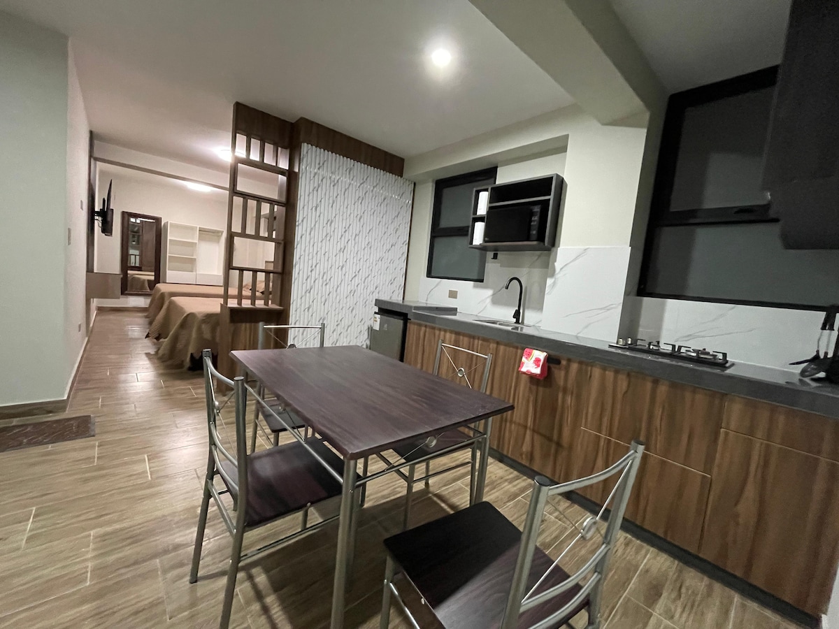 Komfortabel mini lejlighed af typen STUDIO i et roligt og sikkert boligområde, med de nødvendige bekvemmeligheder for et behageligt ophold, med tekøkken til madlavning, meget tæt på klinikker, indkøbscenter, byens centrum 5 minutters gang. En halv blok fra Av. Grau, med grønne områder og Plaza Vea, biografer, bagerier, caféer. Den har balkon ud mod gaden, privat badeværelse med bruser med hydromassage, 40" Smart TV, køkkenudstyr. Beliggende på femte sal, adgang via bred trappe og med gelænder.
