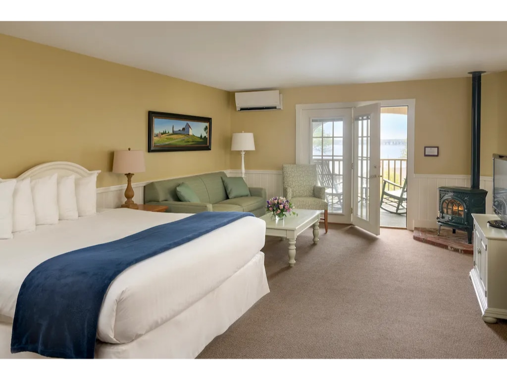 Discover the rich heritage and peaceful atmosphere in Boothbay Harbor when you book a stay in our charming Lodge Room! Ideally located along the water and close to the forest, our lovely space offers the ultimate escape for you! • Lodge Room with 1 King bed • Private Porch • PARTIAL OCEAN VIEWS • Watch your favorite show on the TV • Cozy up by the gas fireplace • iPod Docking Station • Shared Outdoor Pool + Hot Tub • On-Site Spa • Complimentary shuttle to downtown • FREE Parking