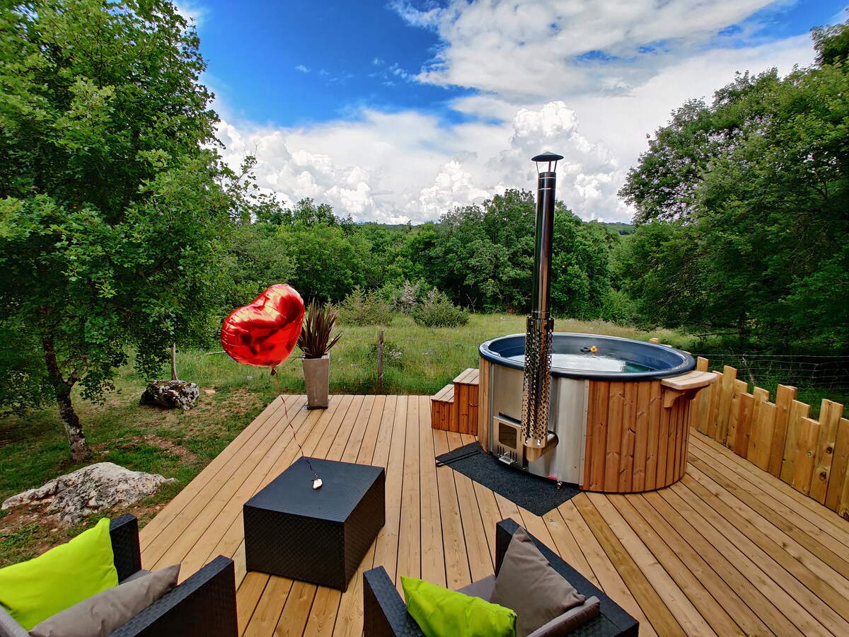 FANTASTISK til et romantisk ophold, i al slags vejr og i enhver årstid. Cocooning chalet på 32 kvm, komfortabel, i hjertet af naturen. Privat og ubegrænset nordisk bad, bålplads, have og terrasse udstyret. Når du er nede i det varme vand, kan du nyde den smukkeste stjernehimmel i Frankrig, opleve magiske øjeblikke og skabe uforglemmelige minder.