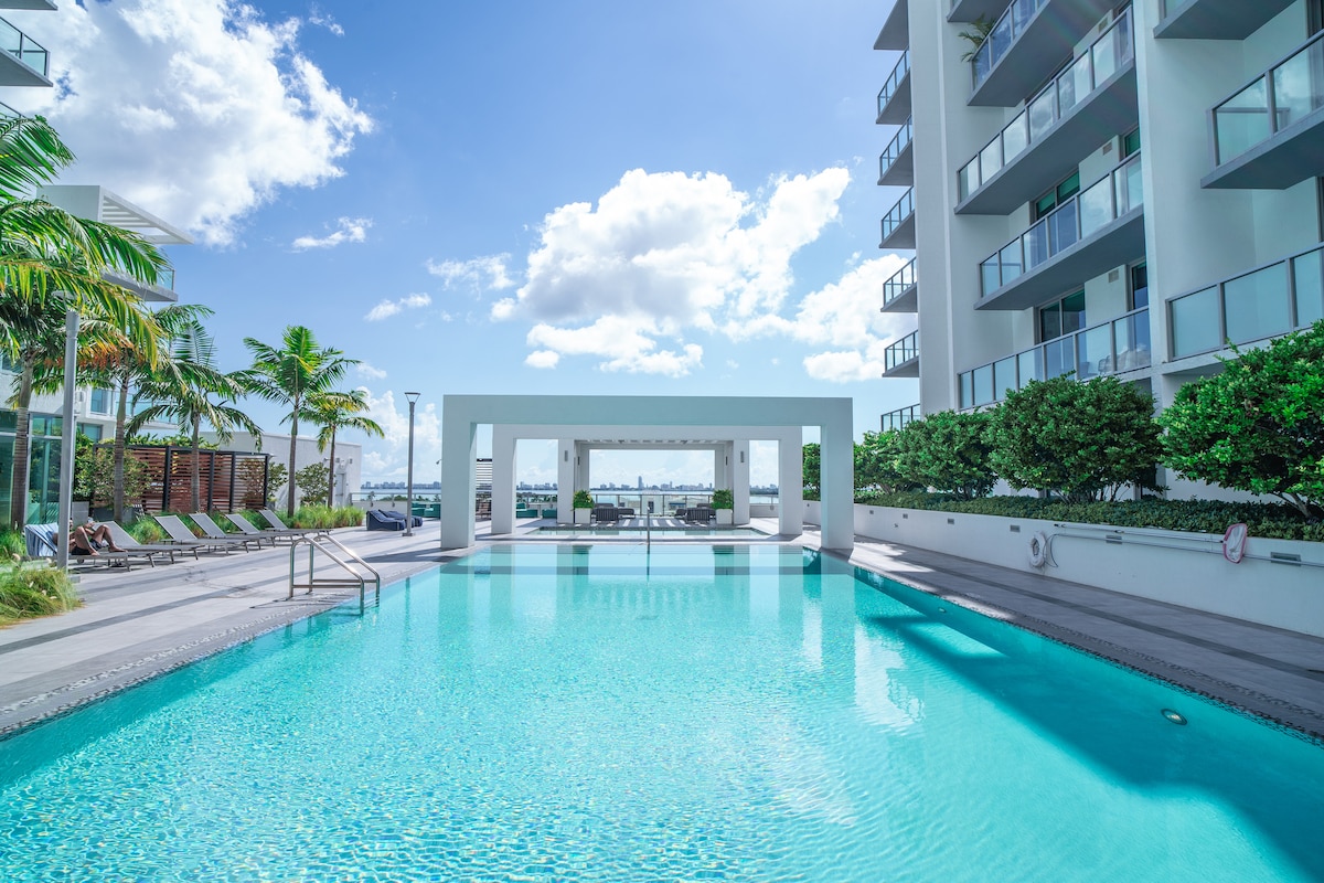 Penthouse Level Studio med DIREKTE VANDUDSIGT i Miami Design District, et rum med udsigt, indrettet med masser af kærlighed og inspireret af havet. Boligen har 12'' gulv til loft-vinduer og adgang til faciliteterne i resortstil, fantastisk pool med strandhytter, fitnessrum (åbent 24 timer i døgnet), moderne lounge, grillplads, ladestation til elbiler og GRATIS TILDELT PARKERING i selve hjertet af Miami. Maksimalt 3 gæster. Gåafstand til de bedste shoppingmuligheder, restauranter, museer og meget mere.