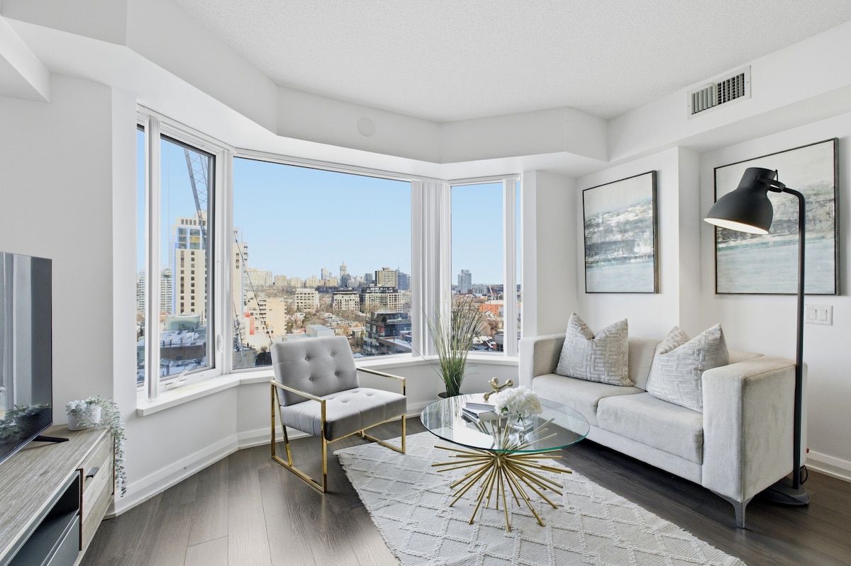 Velkommen til din moderne luksusferie i midtbyen! Helt ny luksuriøs skyskraber beliggende i hjertet af Torontos pulserende Yonge & Eg-kvarter. Perfekt til erhvervsdrivende og familier, der leder efter en central beliggenhed med nem adgang til alle steder i Toronto. Beliggende lige ved krydset mellem Yonge & Eglinton med øjeblikkelig adgang til metro, restauranter, caféer, indkøbscentre, supermarkeder og offentlig parkering. Der er ikke sparet på noget, da denne suite er fyldt med alle de moderne faciliteter og 1 GB WIFI-hastighed.
