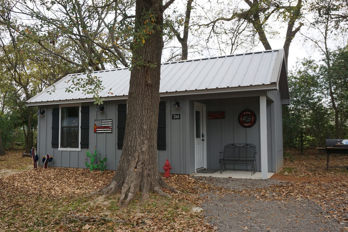 En unik udflugt med familie og venner. Tæt på A & M, Round Top og flere lokale vingårde. Lej en eller flere hytter på denne ejendom. Hver hytte har sit eget udendørsområde og kulgrill. Denne hytte har et roligt udendørsområde, der deler en bålplads med hytten ved siden af. Dine hunde er velkomne. Der er en indhegnet gård med denne hytte. Vores hundegebyr er 50 dollars per hund. Longhorns er i et indhegnet område, så gæsterne kan nyde og se på afstand - hold dig 10' væk fra hegnet.