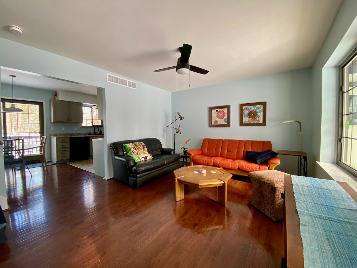Smuk landlig beliggenhed på 5 hektar omgivet af skov for enden af en privat vej. Gæster vil nyde hele den nederste etage af vores hjem og have deres egen private indgang. Døren på Airbnb-siden låser. Udendørsområdet omfatter en terrasse med spiseområde udstyret med LED-belysning, pickleballbane, 2 hængekøjer, ildsted, kulgrill, parasol, Tiki-fakler. Kæledyr er velkomne! 60,00 dollars gebyr for kæledyr Inden for 15 minutter til downtown Ann Arbor, Brighton, Novi og området Metro Parks. Hastighedsgrænse 15MPH