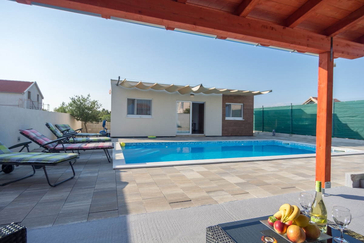 Holiday house Jona is located in a small village in the heart of "Ravni Kotari". The house is located on a 7000 square meter ranch that has a large guest-only swimming pool and is surrounded by vineyards and various fruit trees that guests have at their disposal. The house is ideal for a complete dream vacation where you can afford complete peace of mind. House Jona is new and fully equipped with dishwasher,washing machine,coffee aparat,grill,air conditioning,wi-fi internet, ultra-slim TV, etc.
