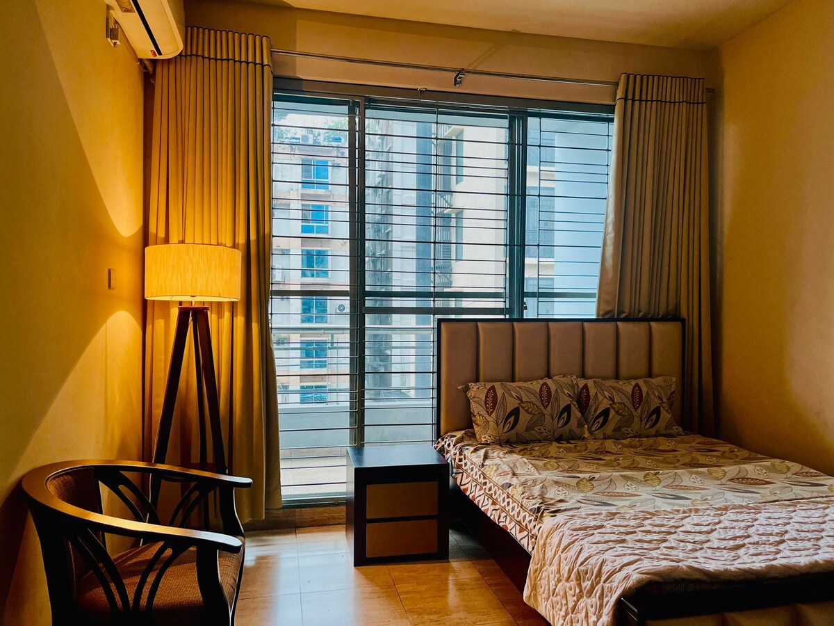 Moderne lejlighed med to soveværelser Bekvemt beliggende i nærheden af terminal 1 og 2, ved siden af terminal 3 Frisk sengetøj og hyggelige senge sikrer et afslappende ophold Lokale busser giver nem adgang til hele Dhaka; nærliggende tog forbinder til alle større byer Omgivet af spisemuligheder og indkøbscentre **Ingen antisociale aktiviteter ** Venlig, engelsktalende vært til rådighed for at hjælpe