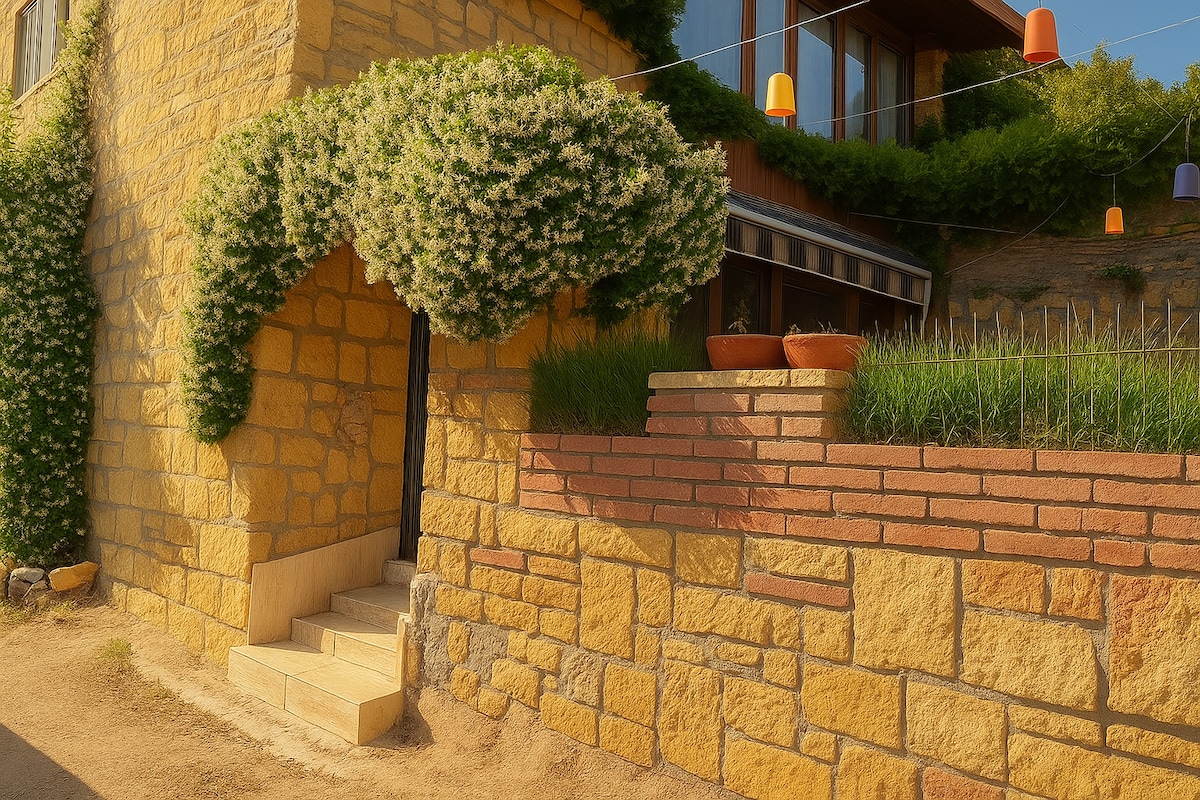 Vores stenhus med karnap er designet til to personer eller små familier, der kan bo komfortabelt med en lukket areal på 55 m2, en privat have på mere end 100 m2, samt en fælles parkeringsplads og en frugt- og grøhave. Du kan nyde udsigten over Det Ægæiske Hav fra næsten alle steder i vores hus hele dagen. Du kan nyde middagen med en udsøgt udsigt under træerne med salat og grill, som du har tilberedt med grøntsager, du har plukket fra haven i vores udendørs køkken.