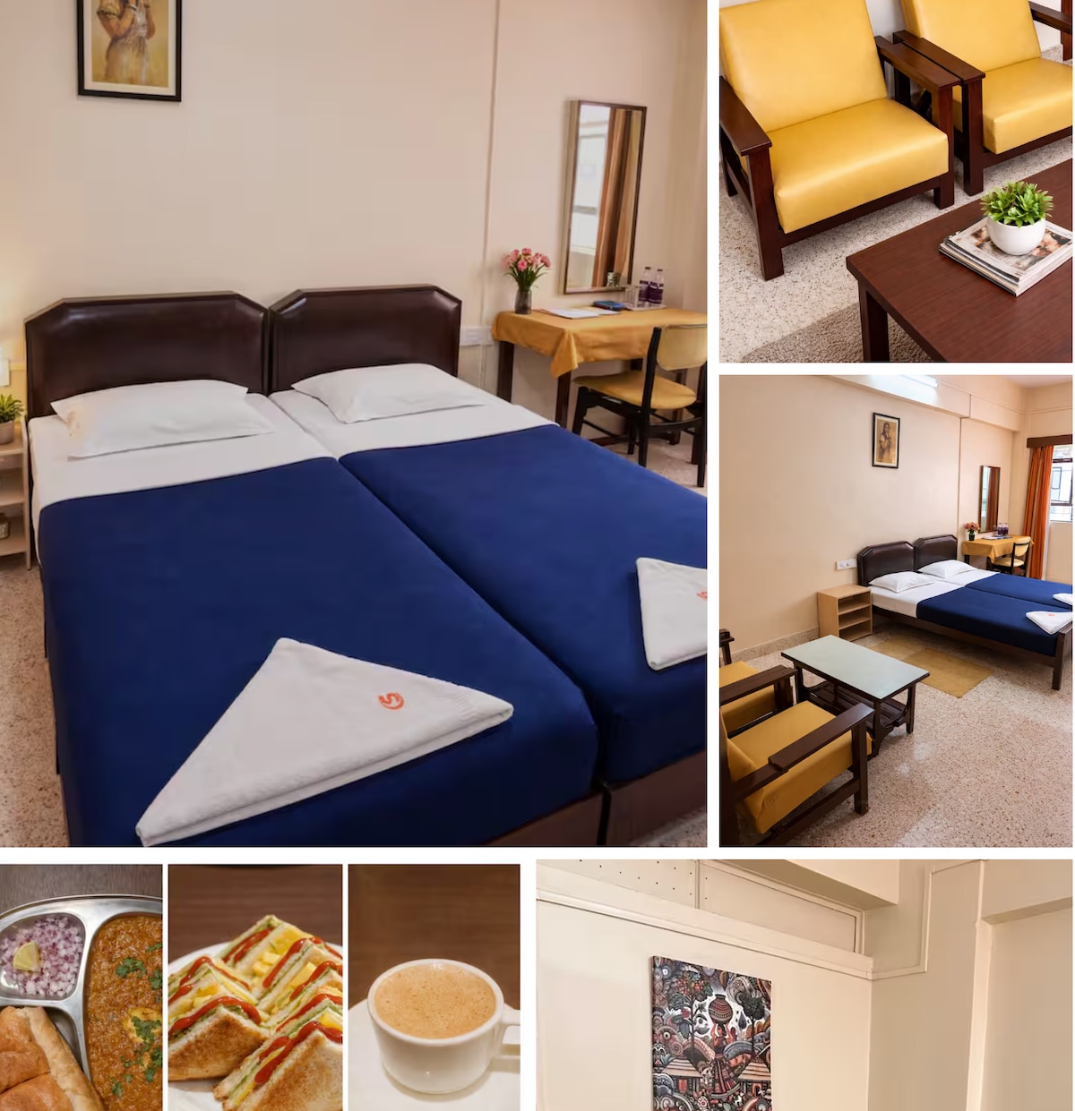 Features & Amenities: - Wi-Fi, Geysers in bathrooms with western commode - Oven, Refrigerator, TV, Washing Machine, Water filter, Chimney and Gas Stove - Kitchen utensils - 24-hour water - Open car parking space, Lift access and CCTV surveillance -AC usage extra charges applicable Location Highlights: Nestled in a serene locality surrounded by greenery, the apartment offers a calm and refreshing environment. Each room comes with a balcony, ensuring excellent ventilation and natural light.