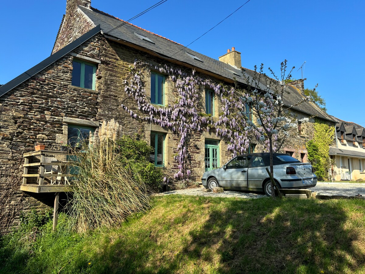 Glem dine bekymringer i denne rummelige, fredfyldte bolig. Stort soveværelse med omklædningsrum med udsigt over landskabet i stueetagen, lukket have, indhegnet og beplantet, terrasse med grill, adgang til den opvarmede swimmingpool et par meter væk, beplantet med hundrede år gamle egetræer med fuglesang. Afslapning og afslapning. 1 time fra strandene, middelalderlandsby 10 minutter væk, sø 15 minutter væk, Brocéliande-skoven 30 minutter væk. Vi laver og sælger brød og brioche på økologisk surdej på stedet.