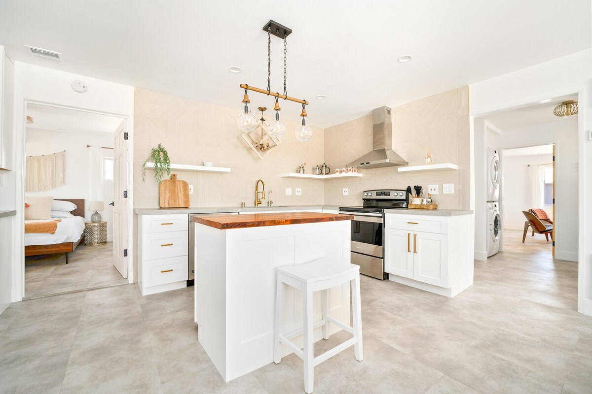 The Joshua Tree Wabi Sabi House embraces this Japanese zen philosophy with a twist on mid-century modern. This tranquil fully-fenced 2.5 acre desert retreat has an unobstructed views of the valley, mountains, and sky. Enjoy a truly curated outdoor space featuring a rock tub, outdoor shower, jacuzzi, hammocks, BBQ, patio dining area, cactus garden and fire pit. Embrace the natural beauty of the high desert to relax, reset, and reinvigorate. Only a 15 minute drive to Joshua Tree National Park.