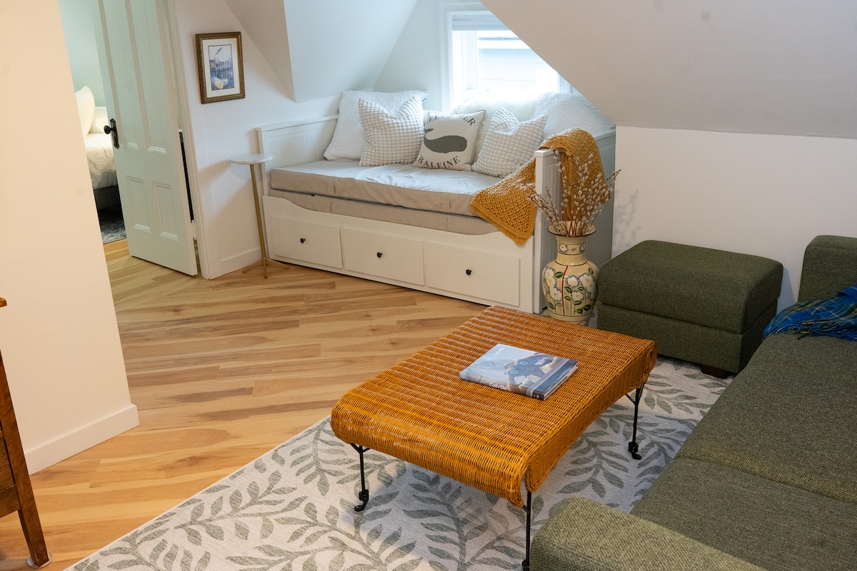Beliggenhed, beliggenhed, beliggenhed! Denne atelierlejlighed ligger i hjertet af Mahone Bay. Restauranter, butikker, købmand, apotek og selvfølgelig de tre kirker ligger inden for 5 minutters gang. Boligen er farverig og munter med en østkyststemning. Lejligheden har et veludstyret tekøkken, hvis du foretrækker at lave lette måltider selv. Der er også en spiseplads, der kan bruges som en meget behagelig arbejdsplads. Nyd vores smukke by!