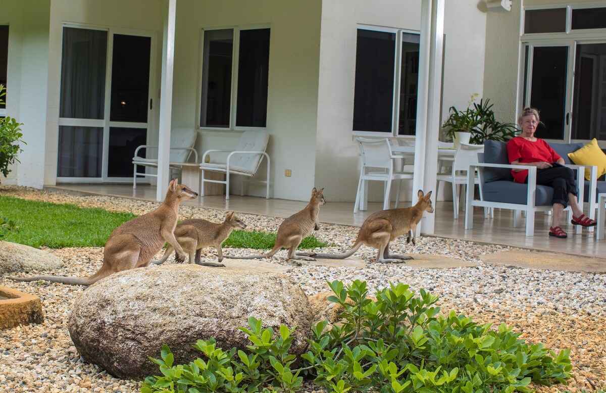 Et lille stykke paradis med en stor pool lige uden for døren og stranden en kort gåtur væk. 5 minutters kørsel til Palm Cove og 30 minutter til byen. Vores gæstehus med strandtema i vores tropiske have har alle de samme bekvemmeligheder som et hjem. Rummelig, airconditioneret, med køkken, grill og møbler ved poolen. Gratis wi-fi + Netflix. Vores hus ligger på den anden side af haven, så vi er lige i nærheden, hvis du har brug for lokale tips eller andet. Kom og bo her, vi vil rigtig gerne dele vores lille stykke paradis med dig!