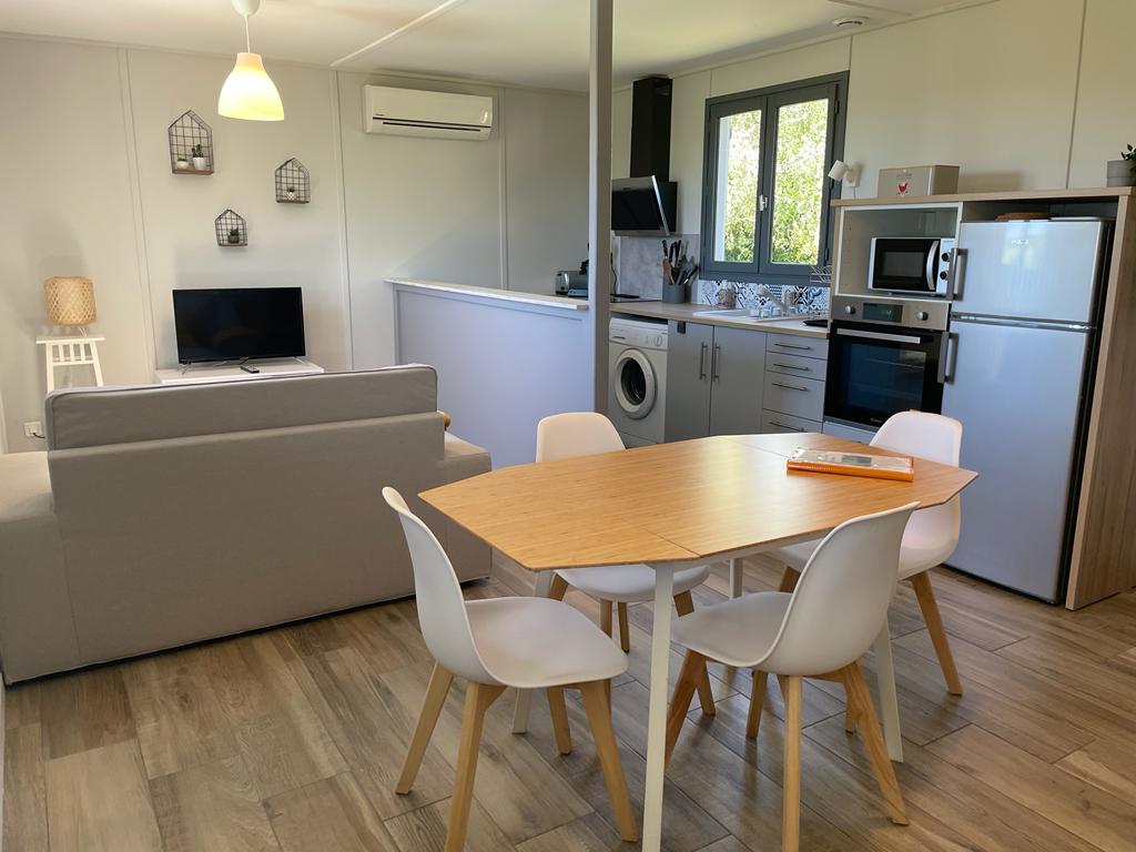 Petite maison de 20 m2 , en pleine campagne. Restaurée avec soin, elle comprend un séjour équipé d'un canapé lit 2 places, d'une kitchenette et d'une salle de bain chaleureuse type chalet. Elle dispose d'un poêle à bois. Elle profite d'un espace ombragé équipé d'un barbecue et d'un salon de jardin et d'un espace qui s'ouvre sur un large paysage de campagne. Un ruisseau longeant la praire, des chemins de randonnées et le village médiéval à proximité invitent à la balade .