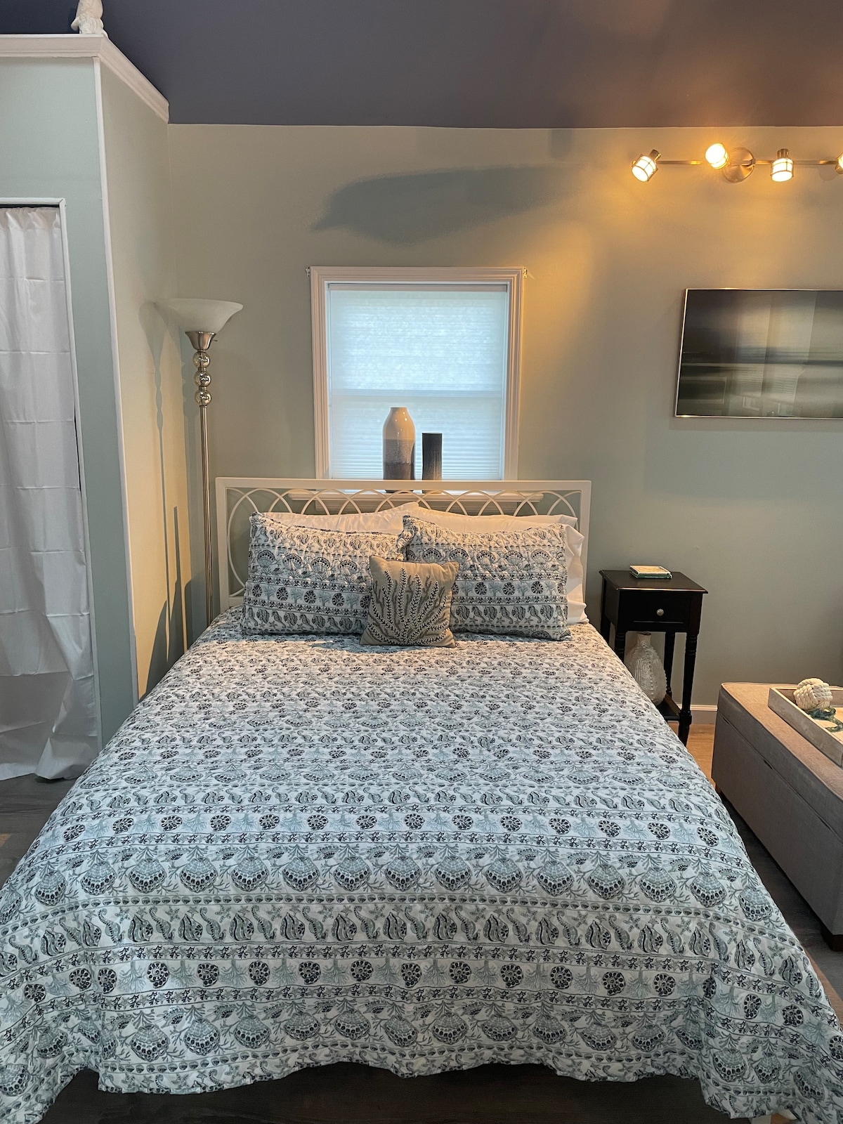 14 minutter nord for Princeton, denne 450 kvm store studiolejlighed har plads til fire. Med egen indgang og dedikeret vaskeri finder interaktion med værter kun sted udenfor. Der er kingsize-seng, komplet køkken, badeværelse, sofa og et 65" tv. Det lille soveværelse lige ved siden af er perfekt til et eller to børn og har en queensize-dobbeltseng, kommode og skab. Vigtigt: Adgang til det lille soveværelse er gennem hovedrummet. (Se mine andre opslag samme sted for ekstra seng/badeværelse)