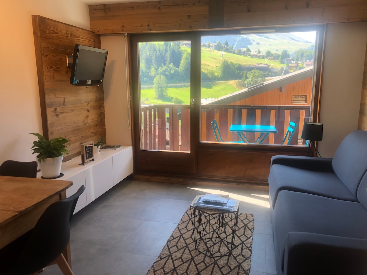 Studiolejlighed, der er blevet fuldstændig renoveret i slutningen af 2021/begyndelsen af 2022, hyggelig atmosfære. Med en smuk udsigt over Aravis-kæden og skiløjperne i Crêt du Merle. Landsbyområde, roligt, men tæt på butikker. Du kan beundre denne smukke udsigt fra den sydvendtede balkon, denne 20m2 lejlighed kan rumme 3 personer. Meget veludstyret og funktionelt studie.