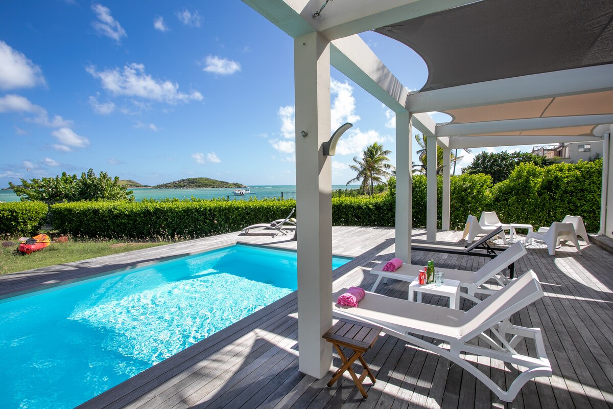 Villa Marine er en helt ny og moderne "caribisk" villa med direkte adgang til cul de sac-bugten... lige ved vandet! 2 store soveværelser med queensize-senge, med komplette badeværelser, trendy fuldt udstyret køkken med en central ø til dine aperitiffer, en stor stue med bord og stole til dine måltider inde, der åbner ud til en terrasse, der også tilbyder et bord og stole til 6 personer, swimmingpoolen og haven foran dig.... privat parkering er til din rådighed