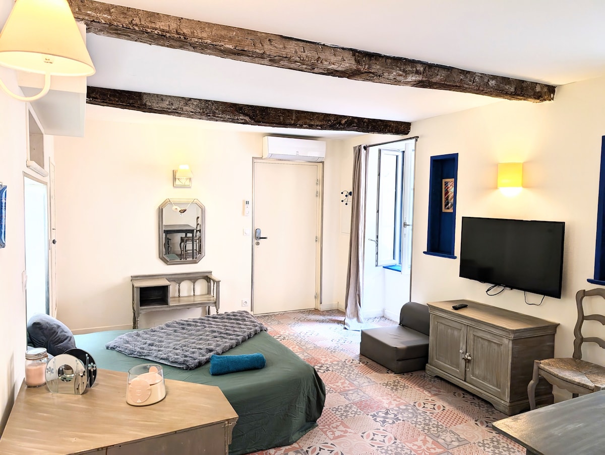 Beliggende i et boligområde i udkanten af skoven, 2 km fra landsbyens centrum og dens butikker, kan du slappe af i fredelige omgivelser. Hytten er et klimatiseret studio beliggende på første sal i en uafhængig villa uden overforliggende nabo. (ejerne bor i stueetagen) Huset har udendørsområder på begge sider, hvilket sikrer ro og privatliv for alle. Du kan nyde en privat sommerkøkken med grill, køleskab, vaskemaskine, bord og liggestole