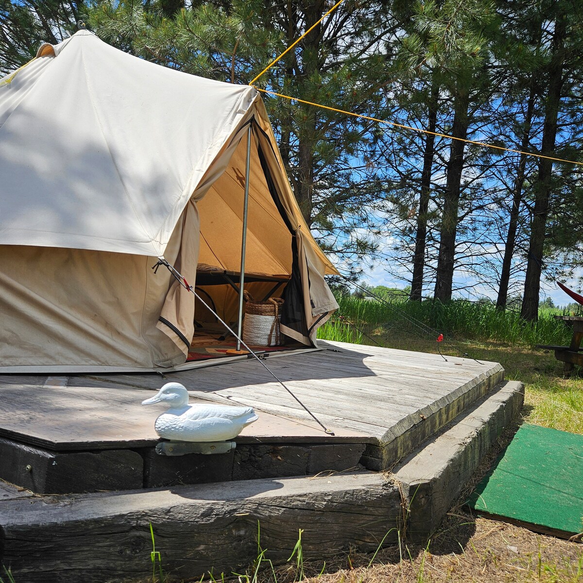 I fyrretræerne er vores 9 unikke campingpladser fredelige, men kun 3 miles fra den lille by Columbia Falls og kun 15 minutters kørsel til indgangen til Glacier park. Dette jurttelt er placeret tættest på brusebadbygningen og har strøm indeni samt to barnesenge med skumpuder. Medbring dine soveposer, eller brug to af vores (puder inkluderet). Vi har også bjørnespray til rådighed til brug under dit ophold (10 $ leje) og brænde til 4 $ pr. bundt eller 3 for 10 $.
