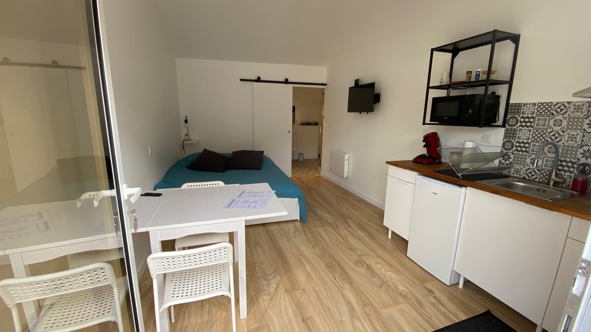 Logement indépendant de 30m2 à 25min du centre de Nantes. Chambre avec lit double, cuisine équipée, coin terrasse individuel. Aéroport à 20 min. A 45 min de la mer Parking gratuit Endroit calme et paisible