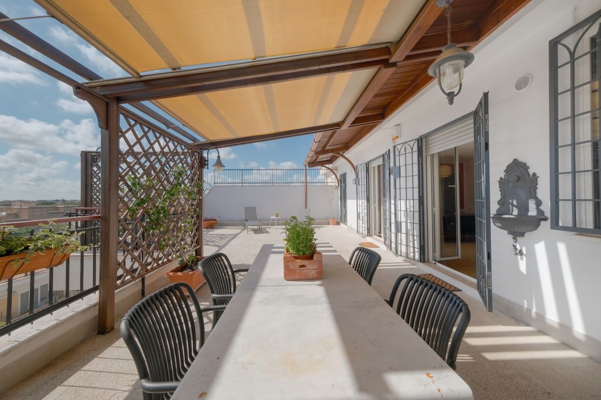 Splendido attico nella meravigliosa zona del Vaticano a due passi dalla Basilica di San Pietro e dai Musei Vaticani. Dispone di una meravigliosa terrazza dove trascorrere serate in relax. Punto strategico per raggiungere Castel Sant’Angelo, Piazza Navona e Campo dei Fiori, nel cuore della città eterna, senza rinunciare alla privacy ed alla tranquillità. A 2 minuti dalla stazione ferroviaria di Roma San Pietro e 10 min da metro Ottaviano per raggiungere la stazione di Roma Termini e l’aeroporto.