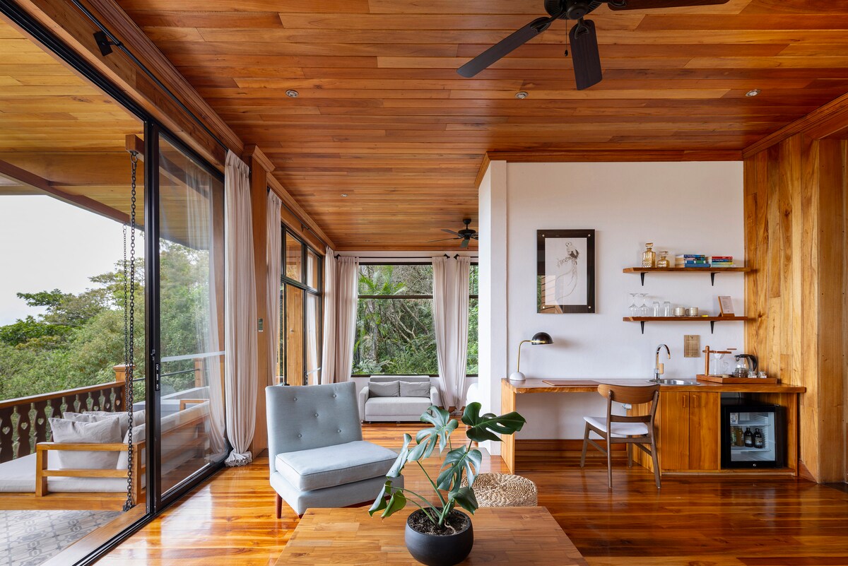 Vores nyligt tilføjede suiter ligger på toppen af den højeste bjergtop på vores frodige skyskovsejendom og tilbyder både den luksus og afsondrethed, du ønsker under dit ophold i Monteverde. Det er 100 kvm med et stort soveværelse med hårdttræsafslutninger, en kingsize-seng og loungeområde, rigelig skabsplads og dobbelt gulv til loft-vinduer med udsigt over skoven og Nicoyahalvøen. Dette værelse har også en ensuite, fuldt møbleret stue med en privat bar og skrivebord, samt et spa-badeværelse med udsigt over skoven, en lille indendørs have, et tilstødende opholdsområde og et dobbelt toiletbord. Denne suite har en enestående adgang til de naturlige omgivelser og en terrasse på 25 m2 med en dagseng i fuld størrelse og jacuzzi. *Bemærk venligst, at disse suiter er beliggende på en treetagers gåtur i en separat bygning 100 meter fra lobbyen.