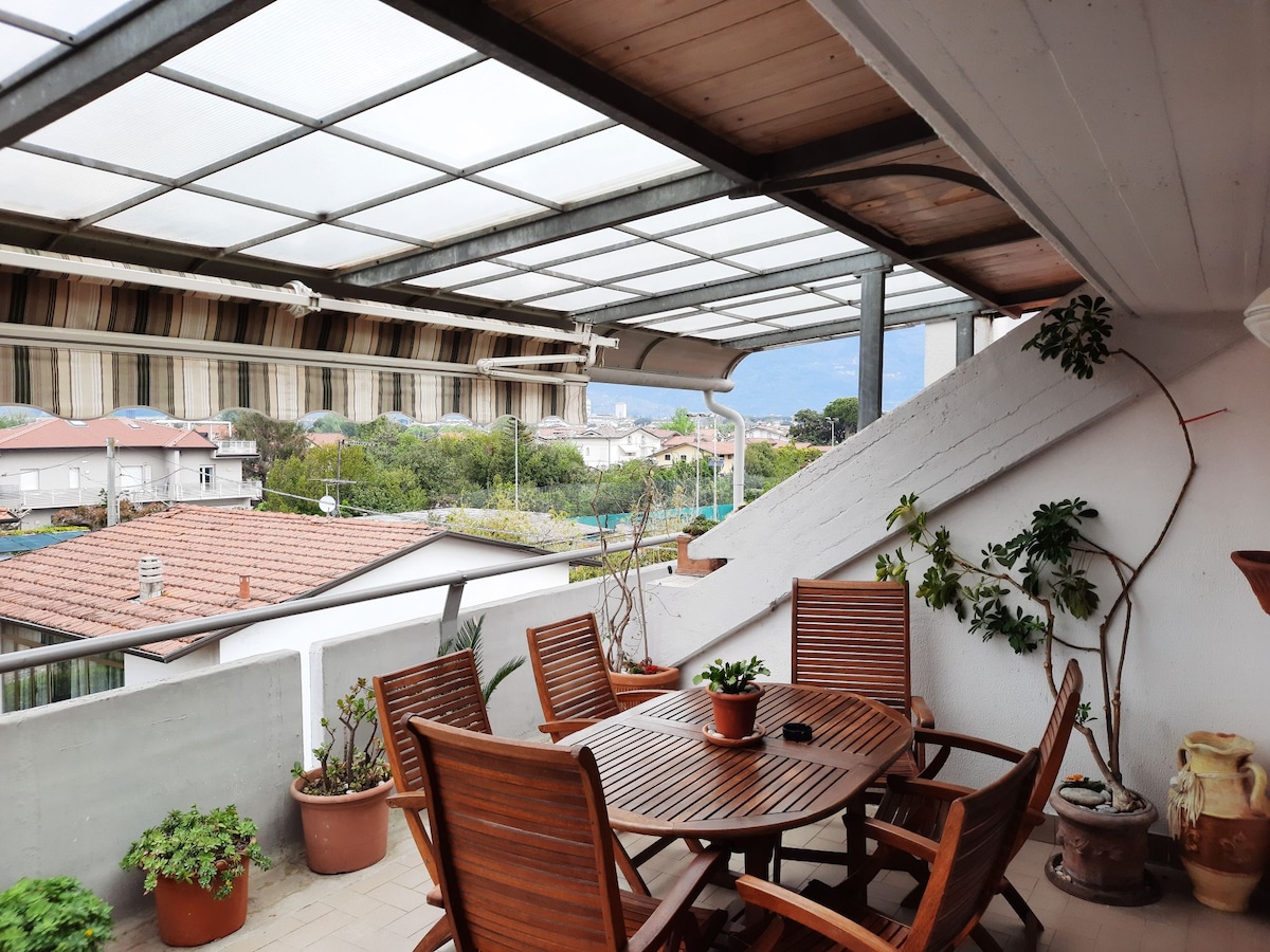 Total afslapning i denne rolige og stilfulde bolig. Augusto-lejligheden tilbyder en stor spiseterrasse med panoramaudsigt over Apuanerne, grønne områder og ro. Taglejlighed på anden sal uden elevator, meget tæt på havet, der består af en stue med et Ariston tekøkken, et badeværelse med en walk-in bruser og et soveværelse med dobbeltseng. Aircondition. 2 service terrasser. Cykelparkering. Der er mulighed for ikke-eksklusiv indendørs lejlighedsparkering.