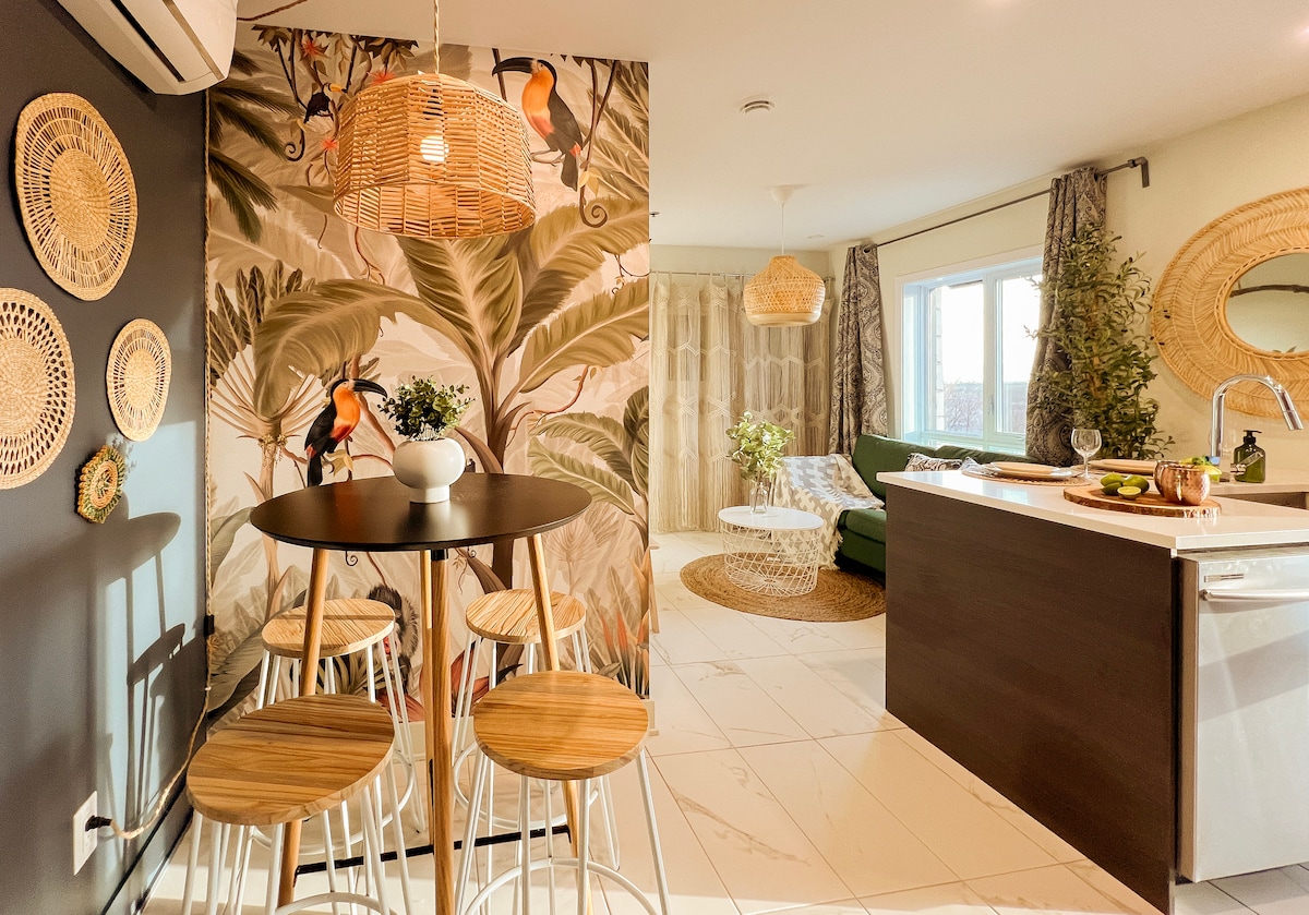 🛏️ Sov som en drøm – blød queensize-seng med sengetøj af hotelkvalitet. Få ro i sindet, efter du har udforsket Montreal. 📺 Netflix og chill – Smart-tv med streaming-apps. 🚿 Moderne og pletfrit badeværelse – 🍳 Fuldt udstyret køkken – Spar penge på at spise ude. Lav mad som en professionel med alle fornødenheder. 🚗 SJÆLDENT FUND: GRATIS parkering! – Parkér GRATIS. 🚀 Arbejde og leg – højhastigheds-WiFi + dedikeret arbejdsområde til digitale nomader. ✅ 14 minutter til downtown Montreal – perfekt til koncerter, festivaler, natteliv.