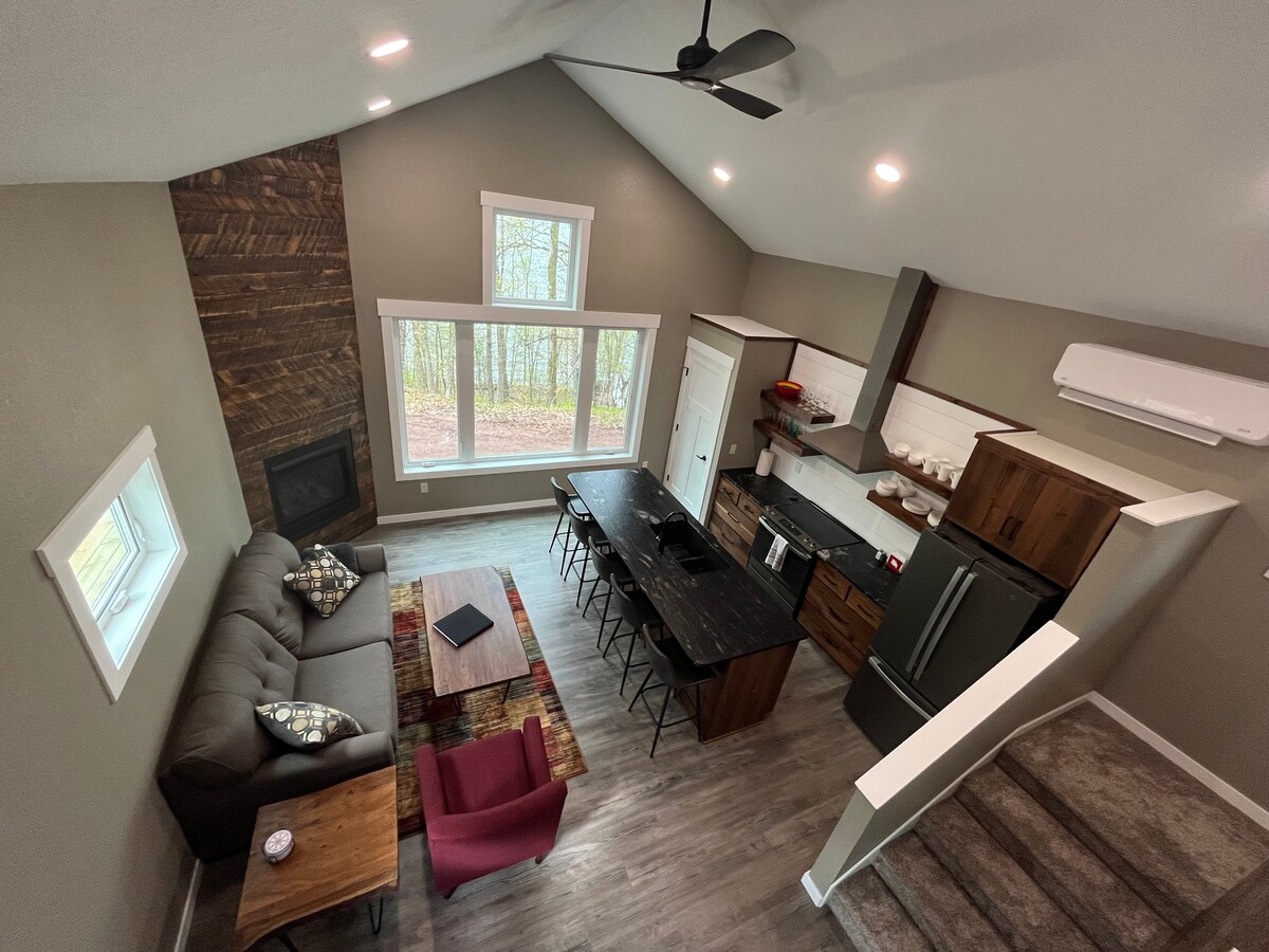 Nyt 520 sf 'ikke for lille' hus på 20 hektar vildmark. Sjov året rundt. Hundevenlig. Stik til autocamper og elbil. Ildsted. Dine Snowshoe Creek- og Little Wood Lake-stier. Gratis kano, kajak, padleboot. 40 dollars/dag minipontoonbåd. Fiskeri. Internet. WiFi. Aircondition. Gaspejs. Sleep by Number. Dejligt badeværelse. Nyt gaskomfur. Ismaskine. 2 fjernsyn. 3 byer + Burnett Dairy/Bistro, 4 golfbaner, DQ til fine spisesteder, minigolf, antikviteter, multiteater, Siren Beach & 'Music in Park'. Dyreliv! Du kommer tilbage.