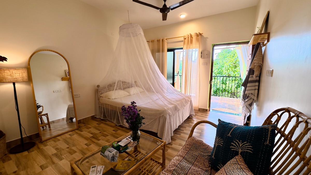Oplev en verden af fred og inspiration på The Pause Project, en hyggelig romantisk Airbnb beliggende midt i en frodig skov i Siolim, North Goa. Perfekt til solorejsende, par og familier, og det er et sted, hvor man kan slappe af. Fordyb dig i bøger, musik, rejseminder og en atmosfære, der føles som hjemme. Lav mad i tekøkkenet, eller udforsk Siolim, der er kendt for sine caféer og barer, med Anjuna, Vagator, Assagao og Morjim, Mandrem-strandene 15-20 minutter væk og 35 minutter fra MOPA-lufthavnen.