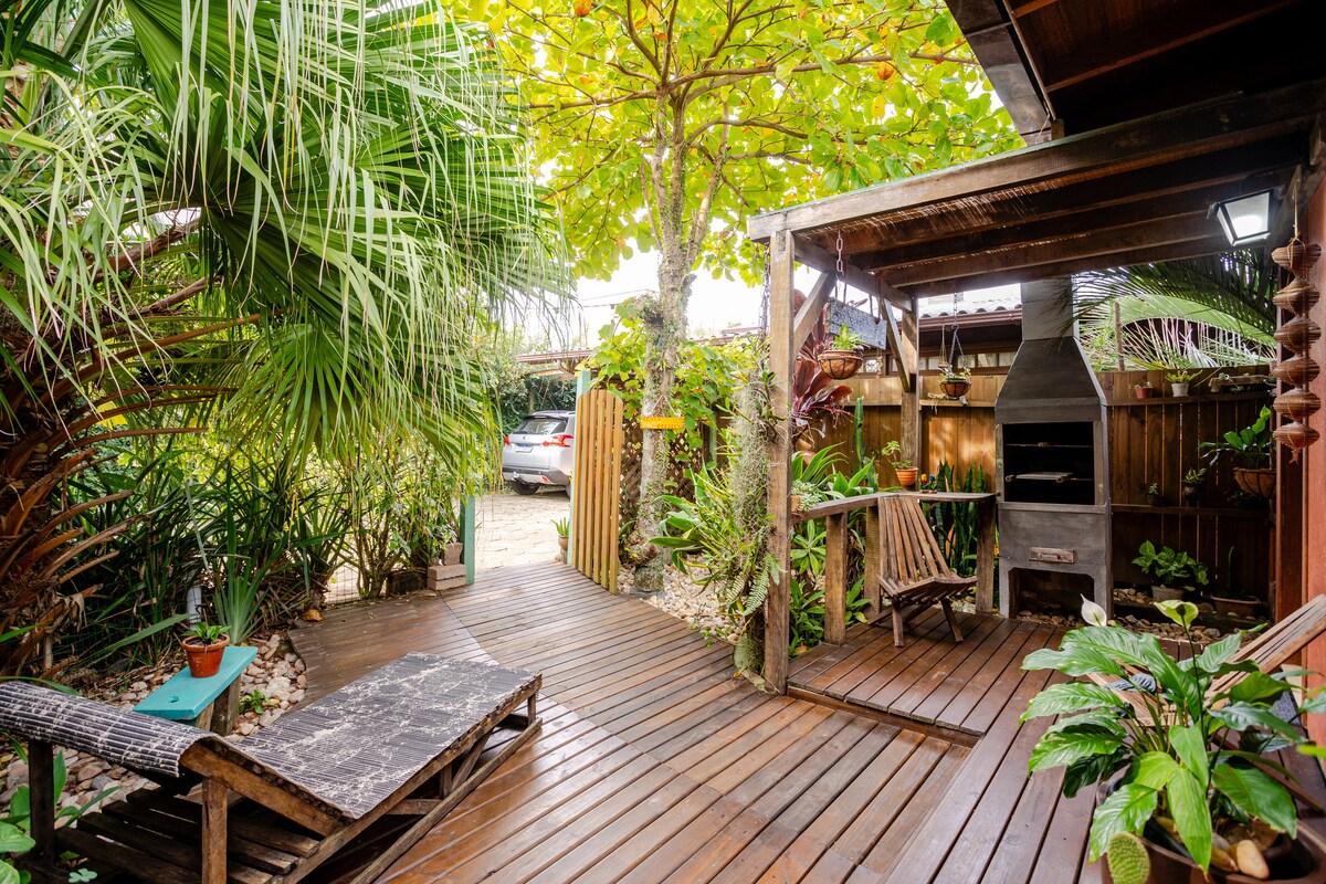 En lille hytte i sandet beliggende i udkanten af Guarda do Embaú! Tæt på centrinho og alt det gode her omkring: strande, stier, kyst, hav, flod, både, surf, hvaler (juli til november). Og handlen med butikker, barer, caféer, restauranter, marked... Kom og nyd det hele ved at gå til fods! Huset er opdelt i tre, men kun to af dem udlejes. Adgangsporten er den samme for alle, haven er fællesområde, og hvert hus har sin egen balkon.