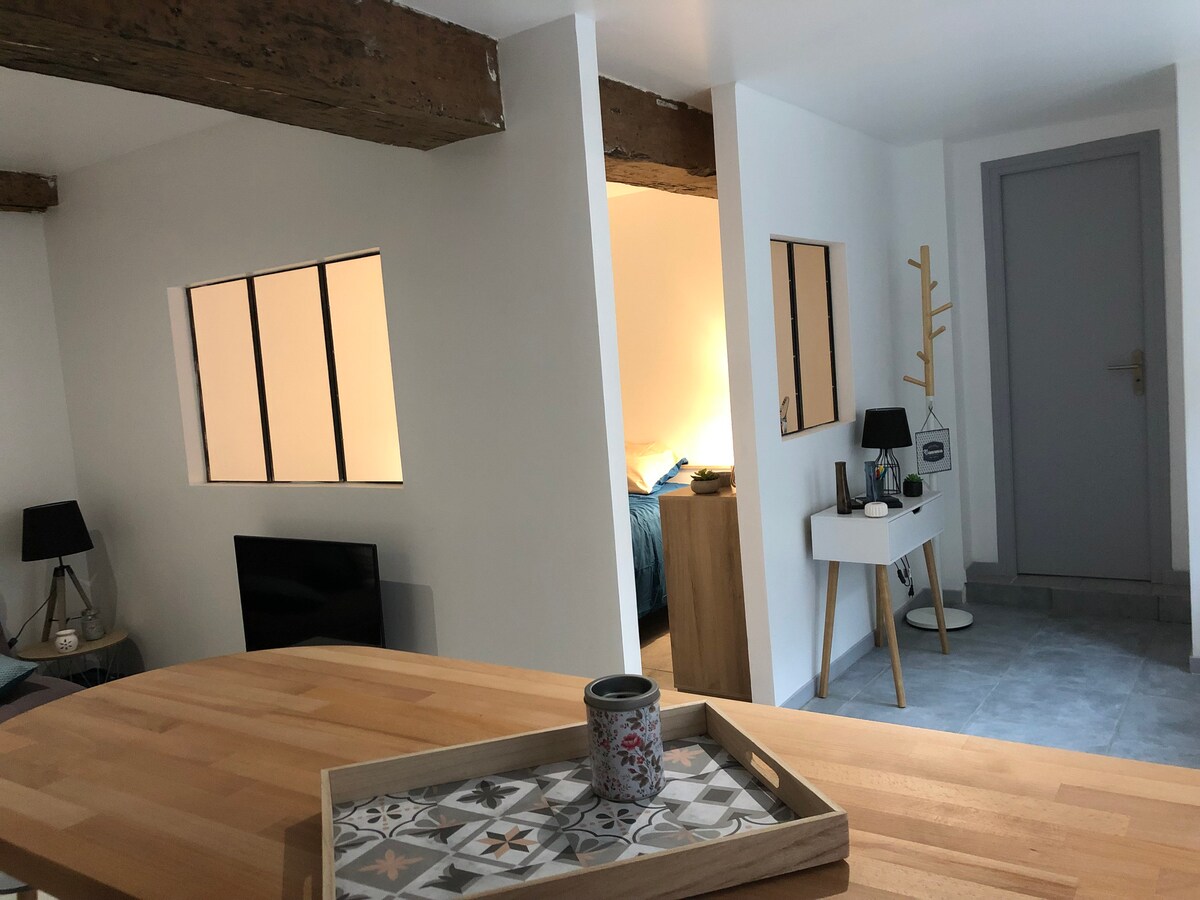 Ny lejlighed på 23 m2 på første sal i et lille hus, ideelt beliggende 300 m fra byens centrum og alle butikker, hospitalet, sportsfaciliteter, herunder vandland, Allier-floden og mindre end 1 km fra CNCS. Den er fuldt udstyret og har en separat indgang. Parkering på gaden er let og gratis. Vi har en anden identisk lejlighed på samme etage.