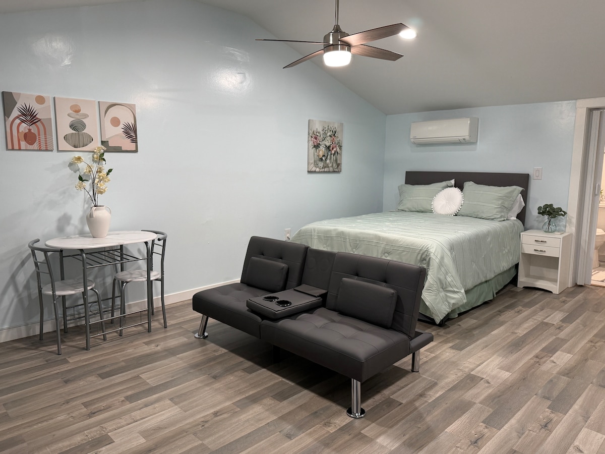 FREE COFFEE! FREE PARKING. No CLEANING FEE! Private Cottage. Kitchen completed with all necessities. Queen bed. Towels, sheets, dishes, iron, ironing board, hairdryer, Keurig and WiFi. Large shower with seats and toiletries provided. Flat-screen TV no cable however NETFLIX! Private drive. Washer and dryer provided for guest with 2 weeks or more booking. We want to share a safe economical place for someone passing through. No parties. No smoking. No pets- no exception.