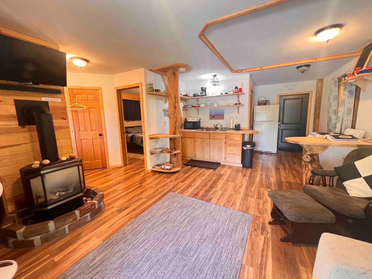 Stille privat soveværelse og tekøkken isoleret fra hovedhuset med fælles brug af solrum imellem. Landdistriktet ligger ved Hwy 44 kun få minutter fra Rapid City Lufthavn. Tesla 11kw destinationsopladningsstik i din garagebugt direkte tilgængelig fra suiten. Starlink 150mbps internet. Kæledyrsvenlig til venlige kæledyr med kæledyrsdør fra suiten ud til den indhegnede baggård og terrasse isoleret fra vores hund og kat. Privat badeværelse har gulvvarme og uendeligt varmt vand med kontinuerlig vandgennemstrømning.