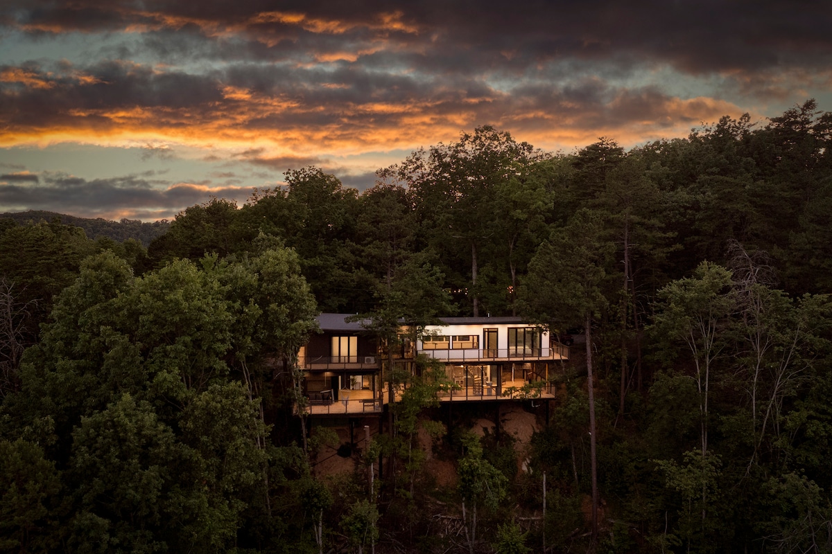 Der er stor sandsynlighed for, at når du ankommer, vil du ikke have lyst til at forlade siden, så brug ikke mere på din smuttur! Moderne bolig med 38 vinduer og ovenlysvinduer. Håndlavede levende kantmøbler, lædersofa, luksuriøst boblebad, højhastigheds-wi-fi, førsteklasses kabel-tv, Sonos-system med 10 højttalere, farvelys, svingende dagseng, bålsteder og 1/4 mile vandfald og en mile vandrestier og gangbroer, og de er alle private. Derudover er der gratis opladning af elbiler.