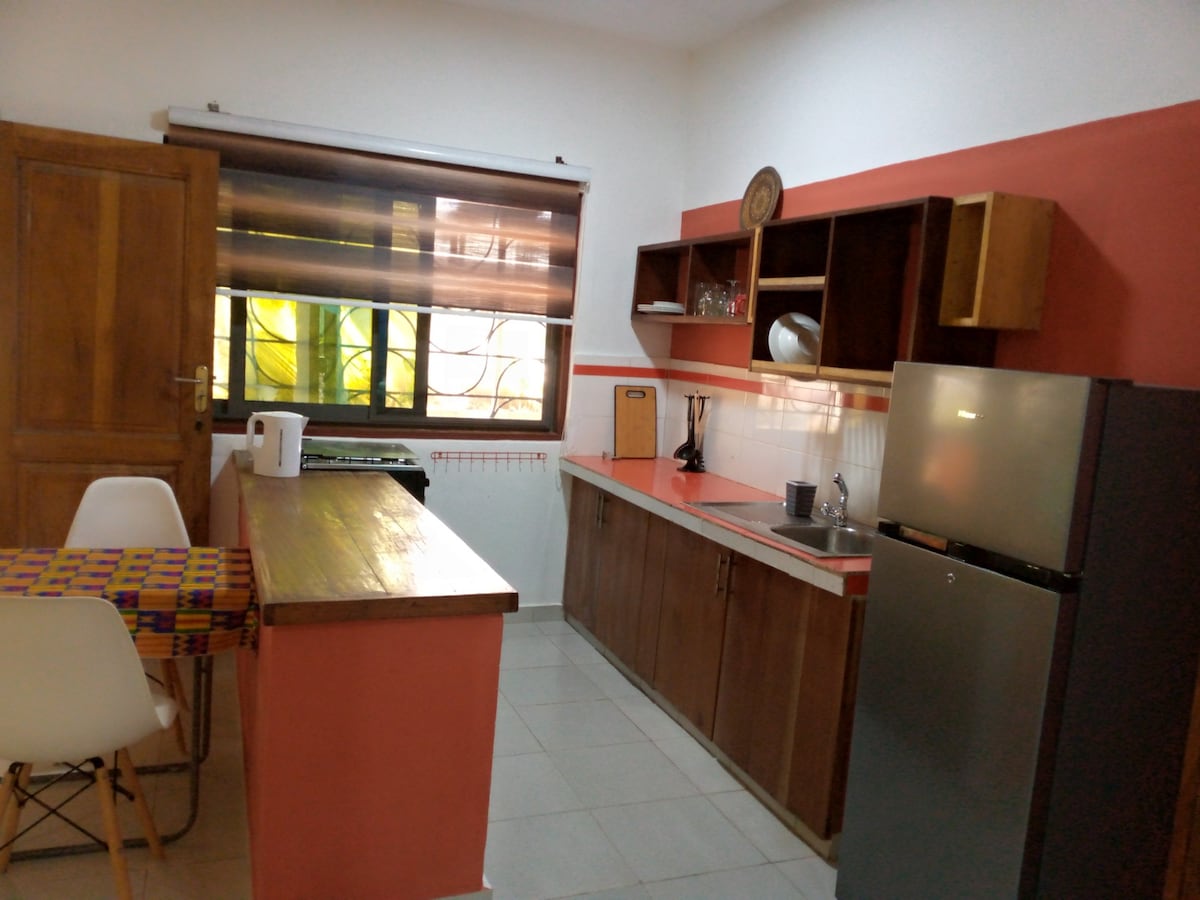 Velkommen til Emilys sted! Det er vores egen flugt fra Accras travlhed. Det har en tagterrasse og en smuk have. Huset har to soveværelser (en dobbeltseng, en tvilling) begge en-suite med varmt vand, og en rummelig åben planløsning spisestue / stue / køkken. Vores husholderske - Peter - bor på stedet og laver fremragende mad. Vi tilbyder gratis morgenmad og andre måltider, der er lavet på bestilling (se menuen under billeder). Stranden (der er adgang via Tills Hotel) ligger fem minutters gang derfra.