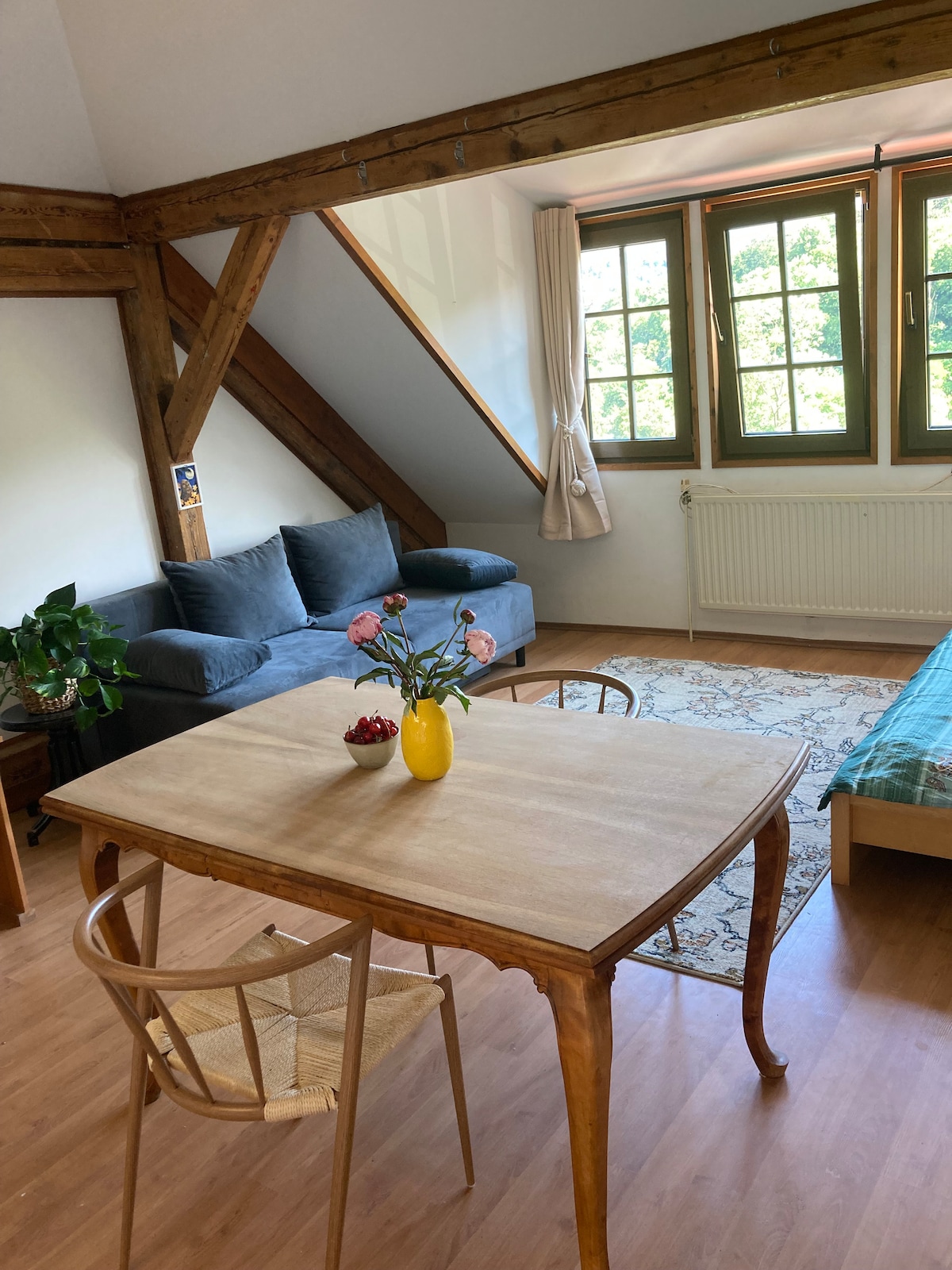 Entspanne dich mit der ganzen Familie in dieser friedlichen Unterkunft. In unserem Einfamilienhaus in ruhiger Lage bieten wir zur Vermietung unsere Dachgeschosswohnung. Sie betreten das Haus durch den hinteren Eingang und gelangen ins Stiegenhaus, welches auch von uns genutzt wird. Sie gelangen ins Dachgeschoss, wo sich die Ferienwohnung befindet. Sie haben hier Ihren eigenen Bereich mit Küche und Bad. Es gibt ein Doppelbett sowie eine ausziehbare Couch, für zwei weitere Personen.