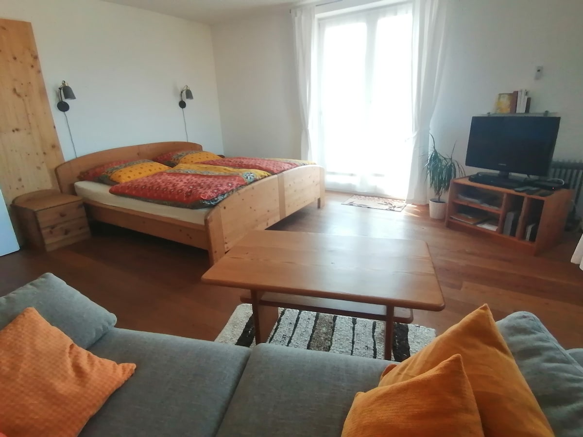 49 m² stor ferielejlighed med gratis parkering i en solrig beliggenhed i udkanten af landsbyen med en vidunderlig udsigt til de schweiziske alper. Stuelejligheden til 2-4 personer har en separat indgang, 1 soveværelse, 1 stue/soveværelse med satellit-tv, indbygget køkken, badeværelse med bruser og toilet, stor udendørs siddeplads. Vandreture direkte fra huset, skilifte og langrendsløjper i nærheden. Bemærk, at der skal betales et turistskat på 2,40 EUR pr. person/dag kontant ved ankomsten.