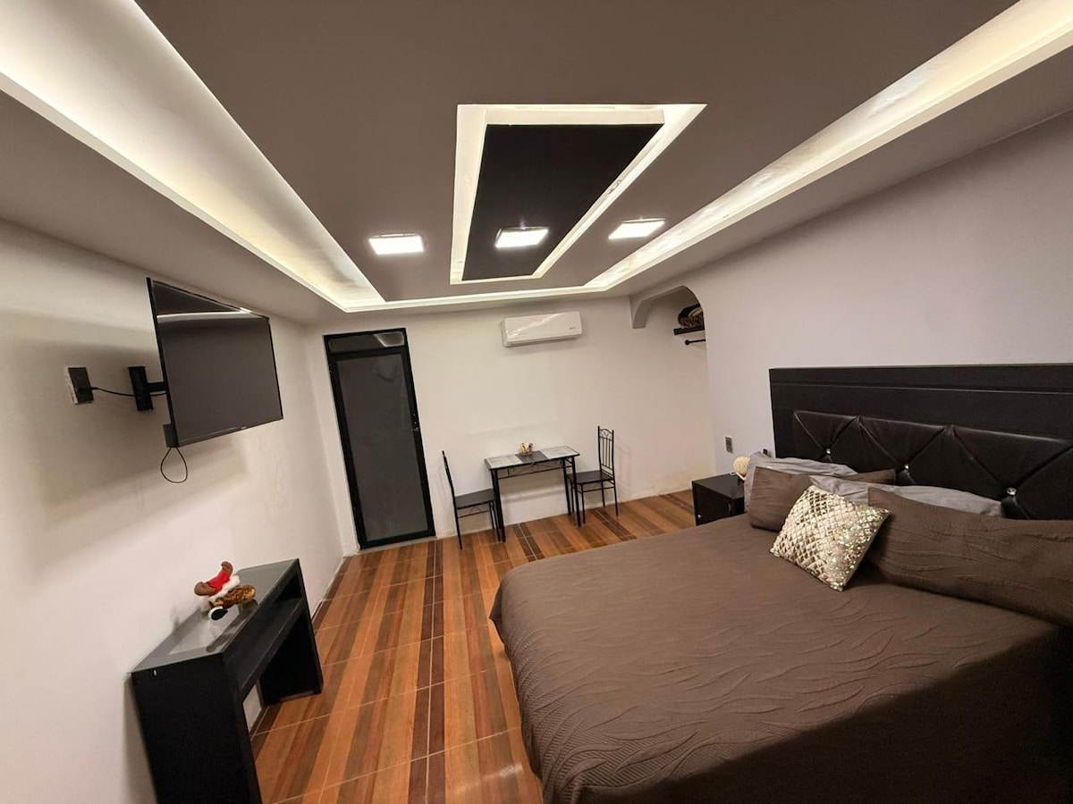 Pequeño Departamento Estudio En el Centro Histórico Cama king size con colchon cómodo calidad Premium Smart tv 55” con cable y Netflix gratis!!! WiFi Perchero Plancha Cocina con: Estufa Mesa con banca y silla Refrigerador Horno de microondas Cafetera Agua purificada Platos, tazas y vasos Sartenes para cocina Cafe, azúcar y crema Aceite Sal Cucharas, tenedores y cuchillos Baño con: Toallas Secadora cabello Jabón corporal Shampoo