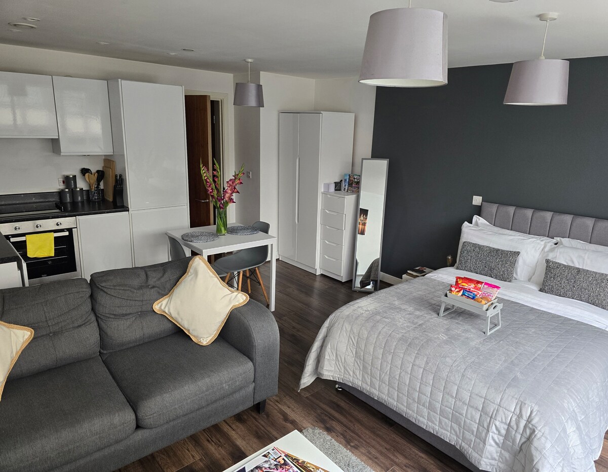 Nyd en luksuriøs oplevelse i denne helt nye, centralt beliggende lejlighed i hjertet af Liverpool. Denne store, men hyggelige lejlighed med fantastiske gulv-til-loft-vinduer på tværs af lejligheden vil imponere dig, så snart du træder ind i lejligheden. Du vil være et stenkast væk fra Liverpools stress og jag med alt, hvad du har brug for lige uden for døren. Men da lejligheden ligger tilbage fra en hovedvej, har den den luksus at være meget stille – det bedste af to verdener!