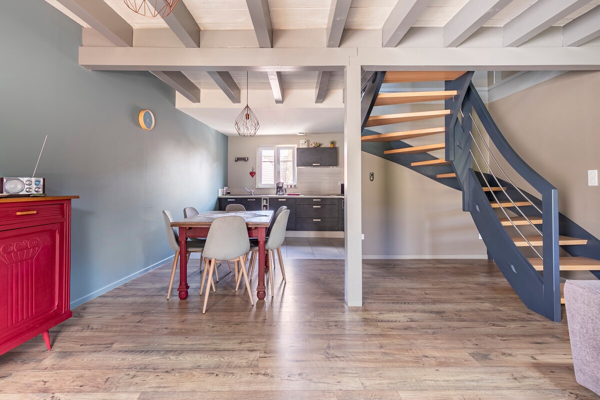 Duplex lejlighed beliggende på 1. sal i et fritstående hus med en økologisk arkitektur i en ren stil. Mellem egetræ, ask, kirsebær, gran og sort poppel, vil du føle træets energi! Boligen ligger 2 minutter fra banegården, tæt på byens centrum og butikker.
