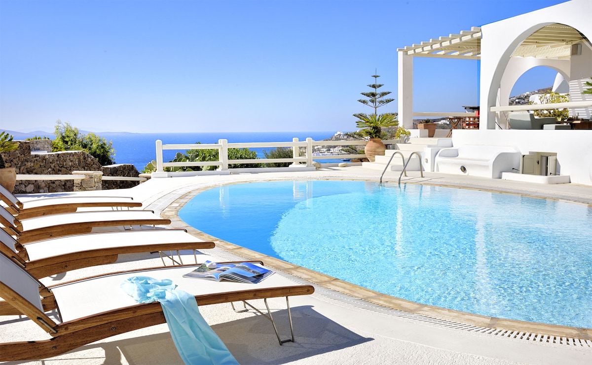 Mare Suite har 2 soveværelser med aircondition og dobbeltsenge, tv, 2 badeværelser og en privat pool. I stuen er der 2 sovesofaer. Det sover komfortabelt 6 gæster. Der er et fuldt udstyret køkken med spisebord. I det private udendørs område er der spisebord med lænestole, solsenge og en privat pool. Afstanden fra stranden er 2 minutters gang, fra Ano Mera med mange butikker 10 minutters kørsel, og Mykonos by 11klm. Fantastisk udsigt over Det Ægæiske Hav og de omkringliggende bakker.