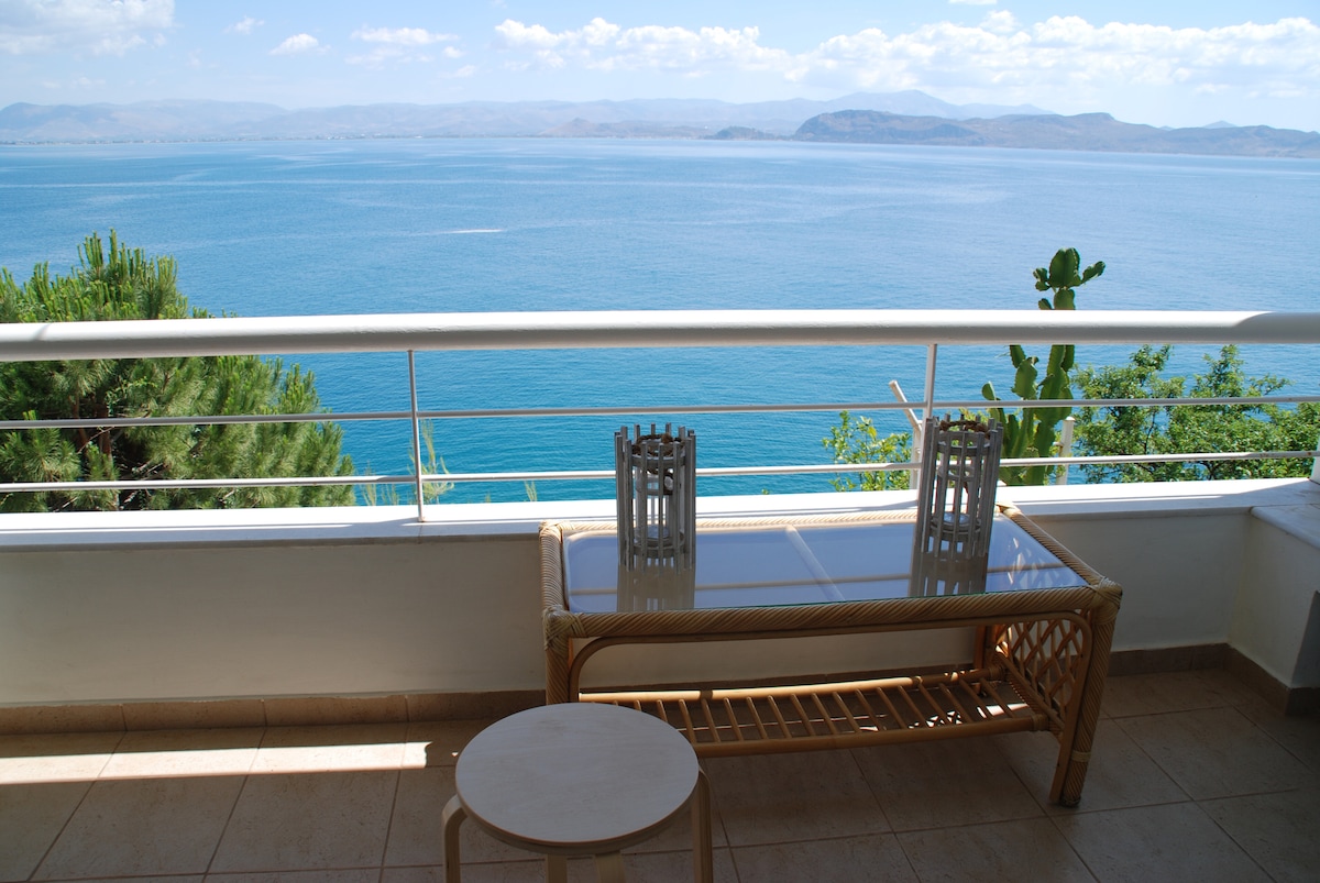 Luksuslejlighed ved stranden med unik balkon med havudsigt, tæt på Nafplio i landsbyen Kiveri. Lejligheden ligger lige ved stranden, kun få skridt fra en lille strand. Lejligheden består af et separat soveværelse med dobbeltseng, en stue med fuldt udstyret køkken, en enkelt sovesofa og en dobbelt sovesofa. Det er en ideel beliggenhed til at slappe af ved havet og til at besøge kun få minutter fra Nafplio og de mest antikke steder i Argolis såsom Mycenaes, Epidaurus, Tiryns, Argos.