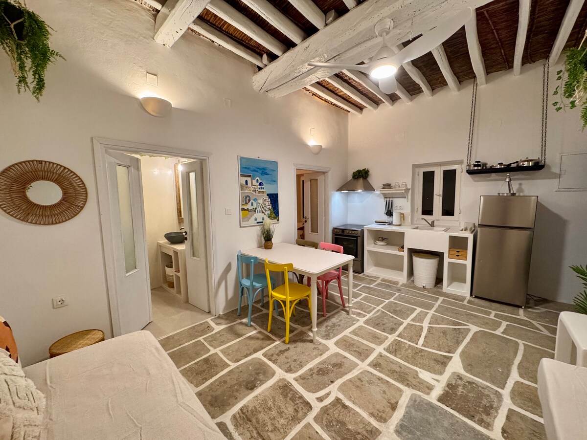 Denne ægte kykladiske lejlighed ligger i hjertet af den maleriske Chora i Ios og er charmerende, farverig og intim, beliggende i et af de mest maleriske og afslappende kvarterer i Chora, hvor du kan få en mindeværdig udsigt over landsbyen (Chora) og Det Ægæiske Hav! Blandingen af traditionelt og moderne indretning skaber elegance og luksus med et strejf af leg - i udvalget af farver i valget af genstande og teksturer.
